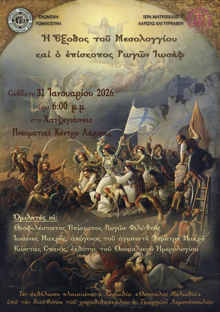 Το Σωματείο «Ενωμένη Ρωμηοσύνη», με την ευλογία της Ιεράς Μητροπόλεως Λαρίσης και Τυρνάβου, διοργανώνει το Σάββατο 31 Ιανουαρίου 2026 και ώρα 06.00’ μ.μ. στην αίθουσα του Χατζηγιάννειου Πνευματικού Κέντρου Λάρισας εκδήλωση με θέμα: Η Έξοδος του Μεσολογγίου και ο Επίσκοπος Ρωγών κ. Ιωσήφ και ομιλητές τους: