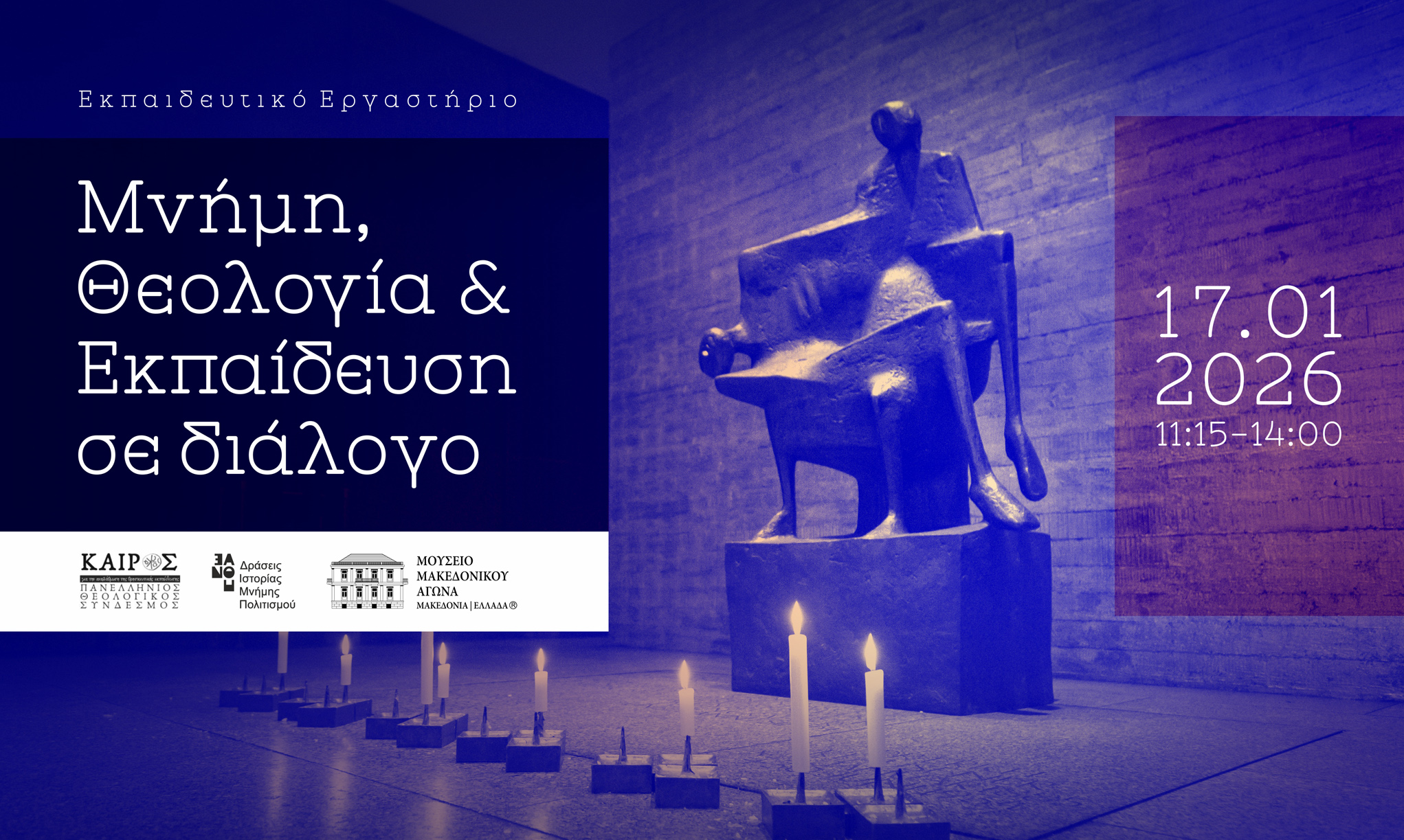 Το Σάββατο, 17 Ιανουαρίου 2026, στις 11:15, ο Πανελλήνιος Θεολογικός Σύνδεσμος «ΚΑΙΡΟΣ – για την αναβάθμιση της Θρησκευτικής Εκπαίδευσης» Κεντρικής Μακεδονίας και το πρόγραμμα Δράσεις Ιστορίας Μνήμης Πολιτισμού, με την υποστήριξη του Ιδρύματος Μουσείου Μακεδονικού Αγώνα και της Νεότερης Ιστορίας της Μακεδονίας και της πλατφόρμας ιστορικής μνήμης mnemonikon.gr, διοργανώνουν εργαστήριο διαλόγου για τη σχέση μνήμης, θεολογίας και εκπαίδευση.