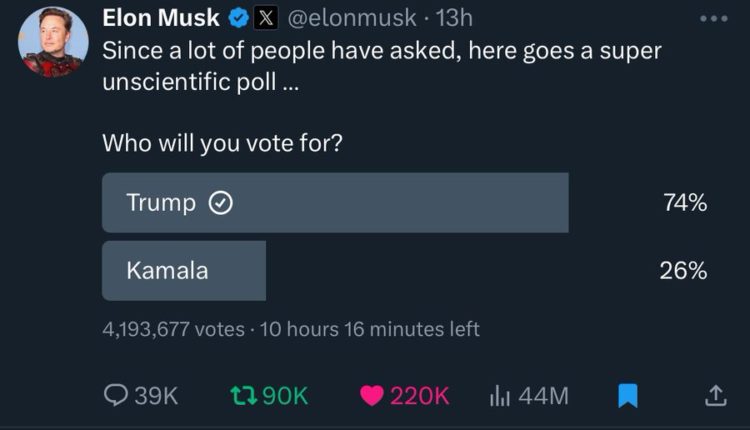 Σε γκάλοπ στο «Χ» προχώρησε ο Έλον Μασκ αναφορικά με το τι θα ψήφιζαν οι Αμερικανοί σήμερα ανάμεσα στον Ντόναλντ Τραμπ και την Καμάλα Χάρις.
