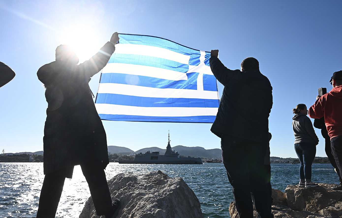 Η φρεγάτα κλάσης FDI HN «Belharra» πέρασε μπροστά από το λιμάνι της περιοχής -σε απόσταση «αναπνοής» από το πλήθος- λίγο πριν καταλήξει στον τελικό της προορισμό, το ναύσταθμο της Σαλαμίνας.