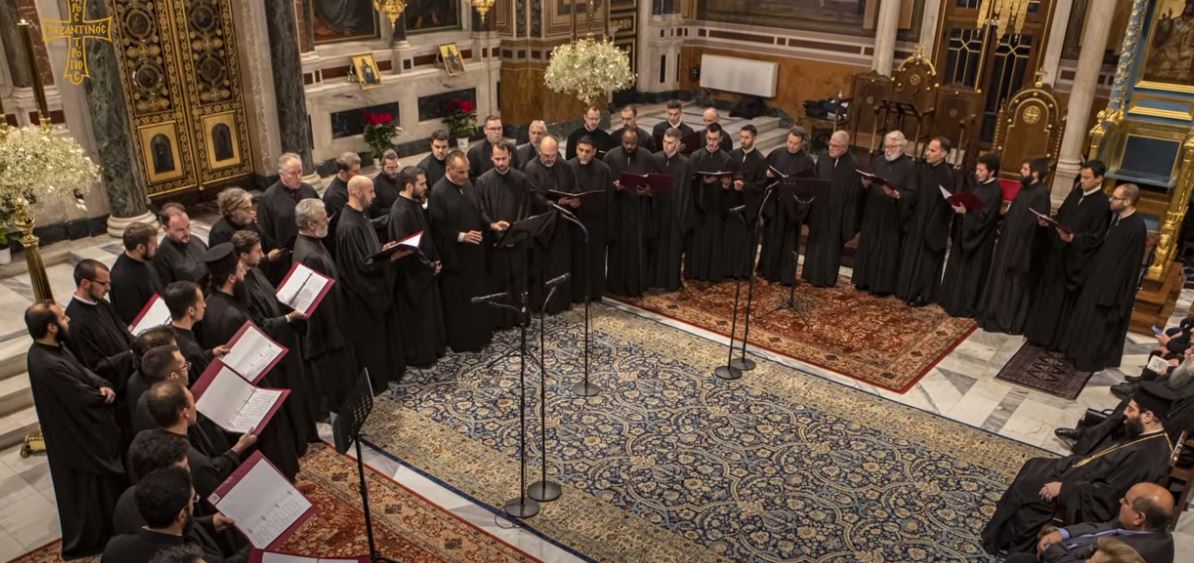 Ακούγεται απόσπασμα από τον στίχο των Ανοιξανταρίων “Άσω τω Κυρίω,” μέλος Μανουήλ Δούκα του Χρυσάφου, τελευταίου Λαμπαδαρίου του ευαγούς βασιλικού κλήρου (Παλατίου — ακμή περ. 1440 – 1465), ήχος πλ. δ’. Ψάλλει ο Βυζαντινός Χορός ΤΡΟΠΟΣ με Χοράρχη τον Κωνσταντίνο Αγγελίδη. Μονοφωνάρης: Κωνσταντίνος Μουτάφης.