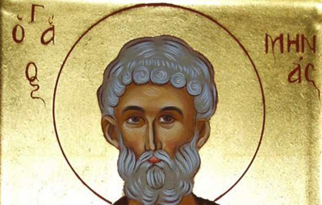 Ο Άγιος Μηνάς ο Μεγαλομάρτυρας, γνωστός και ως «ὁ ἐν τῷ Κοτυαείῳ», γεννήθηκε περίπου στα μέσα του 3ου αιώνα μ.Χ. στην Αίγυπτο από γονείς ειδωλολάτρες. Από νεαρή ηλικία, ωστόσο, η καρδιά του σκίρτησε στην κλήση του Θεού, έγινε χριστιανός και κατάφερε να συνδυάσει την πίστη του με το στρατιωτικό του αξίωμα ως μέλος του ιππικού τάγματος των Ρουταλικών με έδρα το Κοτυάειον (σημερινή Κιουτάχεια της Μικράς Ασίας). Διακρίθηκε για τη φρόνηση και το ανδρείο του φρόνημα, εκτιμώμενος από τους συναδέλφους του.