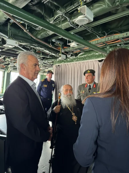 Ο Αρχιεπίσκοπος κ.κ. Γεώργιος τέλεσε αγιασμό και στη συνέχεια, μαζί με τον Υπουργό Δικαιοσύνης και την Υφυπουργό Ναυτιλίας, έτυχαν ενημέρωσης για τον εξοπλισμό και τα προηγμένα συστήματα του πολεμικού πλοίου, από τον Κυβερνήτη, Αντιπλοίαρχο του Πολεμικού Ναυτικού Ιωάννη Κιζάνη.