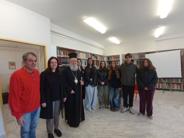 Επίσης, οι καθηγητές και μαθητές ξενάγησαν τον Σεβασμιώτατο στη βιβλιοθήκη του Σχολείου, όπου, αυτό το διάστημα, πραγματοποιείται καταλογογράφηση των εισερχομένων βιβλίων εν όψει του εγκαινιασμού της τον επόμενο μήνα.
