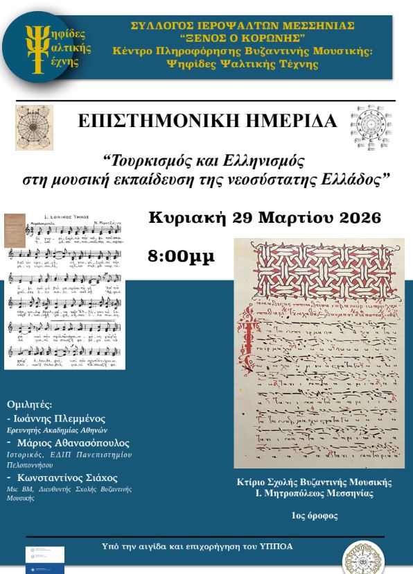 Το Κέντρο Πληροφόρησης Βυζαντινής Μουσικής “Ψηφίδες Ψαλτικής Τέχνης” του Συλλόγου Ιεροψαλτών Μεσσηνίας “Ξένος ο Κορωνης”, και η Σχολή Βυζαντινής & Παραδοσιακής Μουσικής της Ιεράς Μητροπόλεως Μεσσηνίας, διοργανώνουν επιστημονική ημερίδα με τίτλο: «Τουρκισμός και Ελληνισμός στην μουσική εκπαίδευση της νεοσύστατης Ελλάδος», την Κυριακή 29 Μαρτίου 2026 και ώρα 8:00 μμ, στο κτίριο της Σχολής Βυζαντινής Μουσικής (Χρυσοστόμου Θέμελη 1, 1ος όροφος – έναντι Ι. Ν. Υπαπαντής Καλαμάτας).