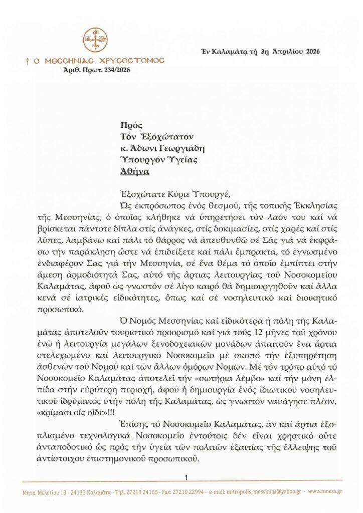 «Εξοχώτατε κύριε υπουργέ, ως εκπρόσωπος ενός θεσμού, της τοπικής Εκκλησίας της Μεσσηνίας, ο οποίος κλήθηκε να υπηρετήσει τον λαό του και να βρίσκεται πάντοτε δίπλα στις ανάγκες, στις δοκιμασίες, στις χαρές και στις λύπες, λαμβάνω και πάλι το θάρρος να απευθυνθώ σε Σας για να εκφράσω την παράκληση, ώστε να επιδείξετε και πάλι έμπρακτα το εγνωσμένο ενδιαφέρον Σας για τη Μεσσηνία, σε ένα θέμα το οποίο εμπίπτει στην άμεση αρμοδιότητά Σας, αυτό της άρτιας λειτουργίας του Νοσοκομείου Καλαμάτας, αφού, ως γνωστόν, σε λίγο καιρό θα δημιουργηθούν και άλλα κενά σε ιατρικές ειδικότητες, όπως και σε νοσηλευτικό και διοικητικό προσωπικό.