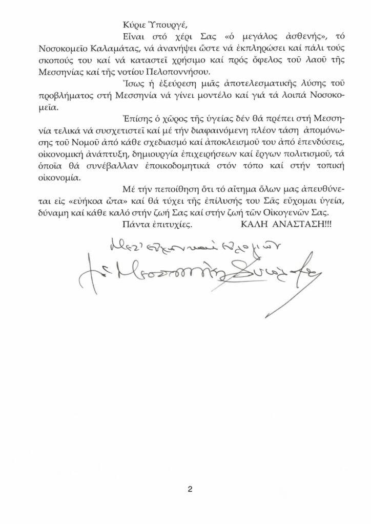 Κύριε υπουργέ, είναι στο χέρι Σας “ο μεγάλος ασθενής”, το Νοσοκομείο Καλαμάτας, να ανανήψει ώστε να εκπληρώσει και πάλι τους σκοπούς του και να καταστεί χρήσιμο και προς όφελος του λαού της Μεσσηνίας και της νοτίου Πελοποννήσου.