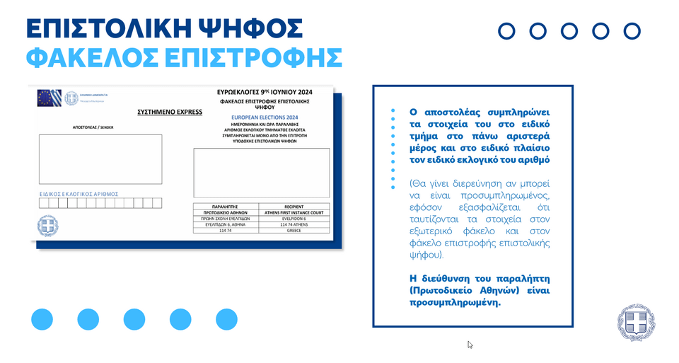- Οι φάκελοι επιστροφής επιστολικής ψήφου αποστέλλονται στην προσυμπληρωμένη διεύθυνση. Ο χώρος μπορεί να είναι σε δημόσιο κτίριο ή σε ιδιωτικό κτίριο, ο οποίος μισθώνεται για τον σκοπό αυτό (πχ εκθεσιακός χώρος).