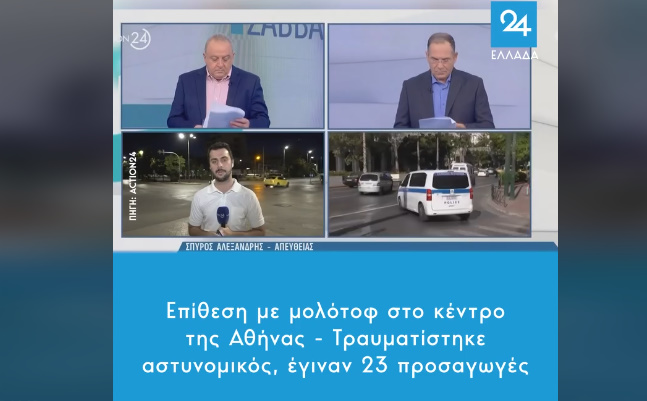 Σύμφωνα με την ΕΡΤ, ομάδα περίπου 30 ατόμων πέταξε μολότοφ σε αστυνομικούς στις οδούς Τρικούπη και Σόλωνος στα Εξάρχεια. Από την επίθεση τραυματίστηκε ελαφριά ένας αστυνομικούς, ενώ υλικές ζημιές υπέστη μια μοτοσικλέτα της αστυνομίας.