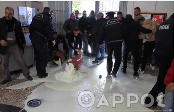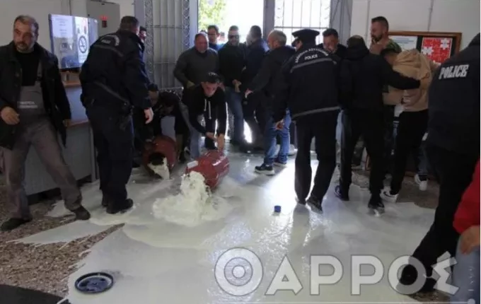Αστυνομικοί που ήταν παρών στο σημείο προσπάθησαν να τους αποτρέψουν με αποτέλεσμα να προκληθεί ένταση, ωστόσο οι αγρότες κατάφεραν τελικά να κάνουν πράξη τον σκοπό τους και άδειασαν τελικά στο εσωτερικό του κτηρίου τα δοχεία με το γάλα.