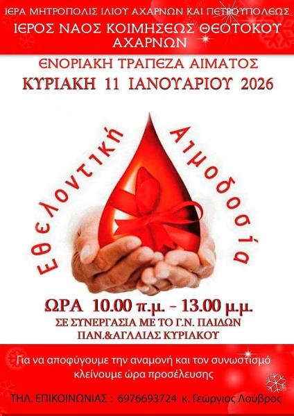 Εθελοντική αιμοδοσία διοργανώνει η ενορία Κοιμήσεως Θεοτόκου Αχαρνών, την Κυριακή 11 Ιανουαρίου 2026, από 10:00 έως 11:30, σε συνεργασία με τον νοσοκομείο παίδων Παναγιώτου και Αγλαΐας Κυριακού.