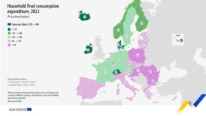 Με άλλα λόγια, η Ελλάδα παραμένει μια σχετικά φθηνή χώρα σε σχέση με τα άλλα μέλη της ΕΕ – οι τιμές αγαθών και υπηρεσιών βρίσκονται στο 87% του ευρωπαϊκού μέσου όρου. Βεβαίως, είμαστε ακριβότεροι από 7 χώρες (Βουλγαρία, Ουγγαρία, Λετονία, Λιθουανία, Ουγγαρία, Πολωνία και Ρουμανία), αλλά είμαστε φθηνότεροι από τα υπόλοιπα 19 κράτη μέλη (με άλλα λόγια, είμαστε η 8η φθηνότερη χώρα στην ΕΕ). (Γράφημα 3)».