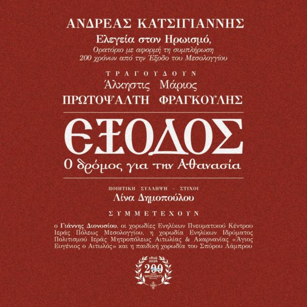 Η Ιερά Μητρόπολις Αιτωλίας και Ακαρνανίας, με αίσθημα ιστορικής ευθύνης και βαθιά συνείδηση της πνευματικής της αποστολής, τιμά τη συμπλήρωση 200 ετών από την Έξοδο του Μεσολογγίου με την παρουσίαση ενός κορυφαίου πρωτότυπου καλλιτεχνικού έργου, το οποίο θα μετατρέψει τη μνήμη σε βίωμα και την ιστορία σε εσωτερική εμπειρία. Σε μια εποχή όπου οι αξίες δοκιμάζονται, η Εκκλησία, αναλαμβάνει την πρωτοβουλία να αναδείξει το διαχρονικό μήνυμα της θυσίας, της ελευθερίας και της ανθρώπινης αξιοπρέπειας, μέσα από το ορατόριο του συνθέτη Ανδρέα Κατσιγιάννη.