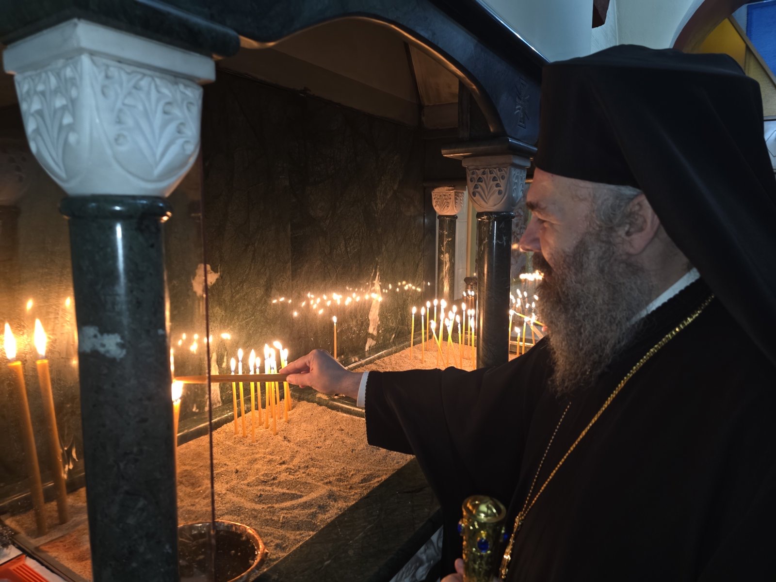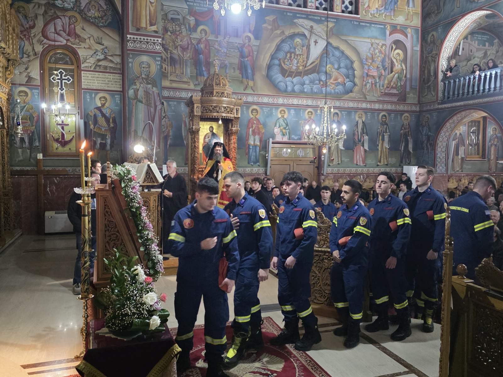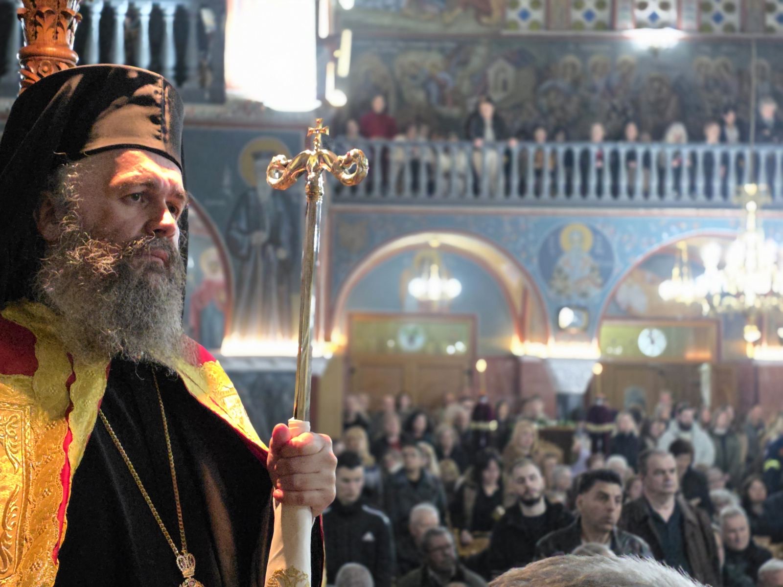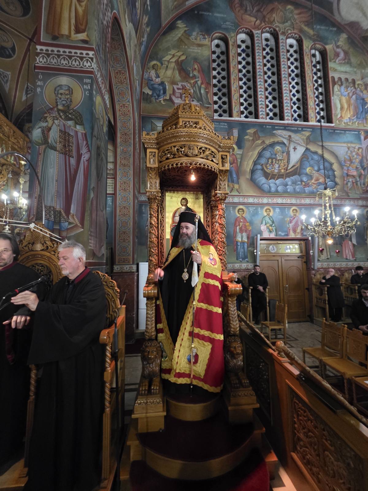 Αμέσως μετά ο Σεβασμιώτατος μετέβη στον Ιερό Ναό της Αγίας Σκέπης Πτολεμαΐδας, όπου χοροστάτησε κατά την ακολουθία της Β΄ Στάσεως των Χαιρετισμών της Υπεραγίας Θεοτόκου και απηύθυνε πνευματική ομιλία προς τους πιστούς.