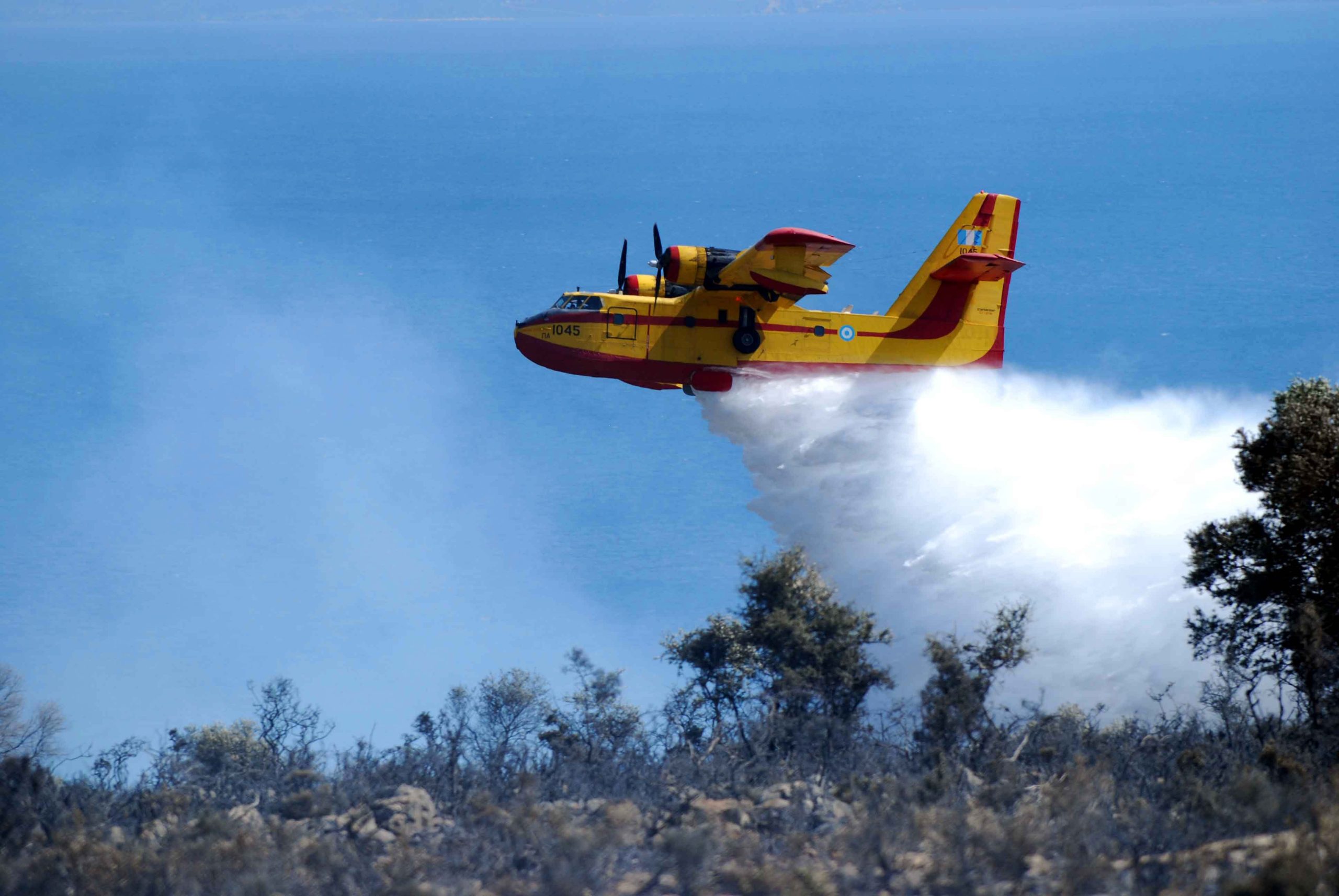 Από αέρος πραγματοποιούν ρίψεις νερού δύο πυροσβεστικά αεροπλάνα.