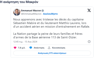 «Πληροφορούμαστε με θλίψη τον θάνατο του σμηναγού Σεμπαστιέν Μαμπίρ και του υποσμηναγού Ματίς Λοράνς σε αεροπορικό δυστύχημα κατά τη διάρκεια εκπαιδευτικής πτήσης με Rafale», ανέφερε ο αρχηγός του γαλλικού κράτους.