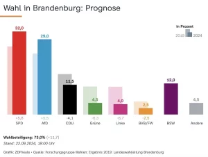Επισημαίνεται πως, σύμφωνα με το ZDF, στο Βρανδεμβούργο, τα κόμματα που λαμβάνουν λιγότερο από 5% δεν εισέρχονται στο κοινοβούλιο του κρατιδίου – εκτός εάν κερδίσουν τουλάχιστον μία άμεση εντολή. Στην περίπτωση αυτή, λαμβάνουν τόσες έδρες στο κοινοβούλιο όσες δικαιούνται με βάση τις δεύτερες ψήφους. Στο 73% έφτασε η προσέλευση των ψηφοφόρων στις κάλπες και ήταν σημαντικά υψηλότερη από ό,τι το 2019, όταν είχε ψηφίσει μόλις το 61,3%.