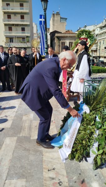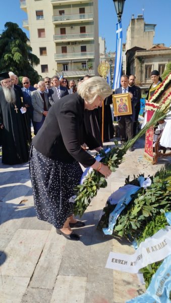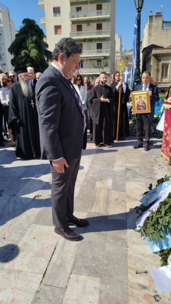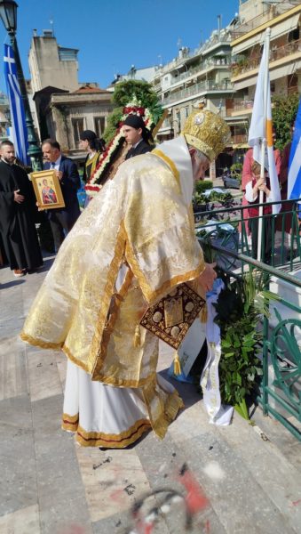 Μετά την Θεία Λειτουργία σχηματίστηκε λιτανευτική πομπή με την εικόνα του Αγίου Εθνοιερομάρτυρος Γρηγορίου του Ε’, η οποία κατέληξε ενώπιον της προτομής του Αγίου Γρηγορίου του Ε’, όπου ανεπέμφη δέησις, κατετέθησαν στέφανοι και εψάλη ο Εθνικός Ύμνος.