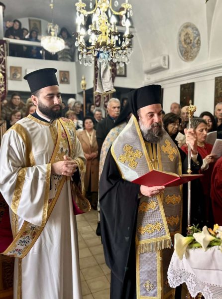 Το ιερό αναλόγιο διακόνησαν ο Διευθυντής της Σχολής Βυζαντινής Μουσικής της Ιεράς Μητροπόλεως κ. Ευτύχιος Μαρκοζάννες και μαθητές της Σχολής.