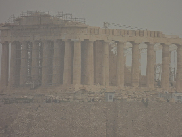 Οι εικόνες από το Λεκανοπέδιο δείχνουν το παχύ στρώμα σκόνης να σκεπάζει την Αθήνα, με την πρόγνωση να κάνει λόγο για υψηλές συγκεντρώσεις σκόνης που «ταξιδεύει» από την έρημο της Σαχάρας και οι οποίες θα κορυφωθούν τις επόμενες ώρες, κυρίως στα δυτικά και νότια, σύμφωνα με το Εθνικό Αστεροσκοπείο Αθηνών/meteo.