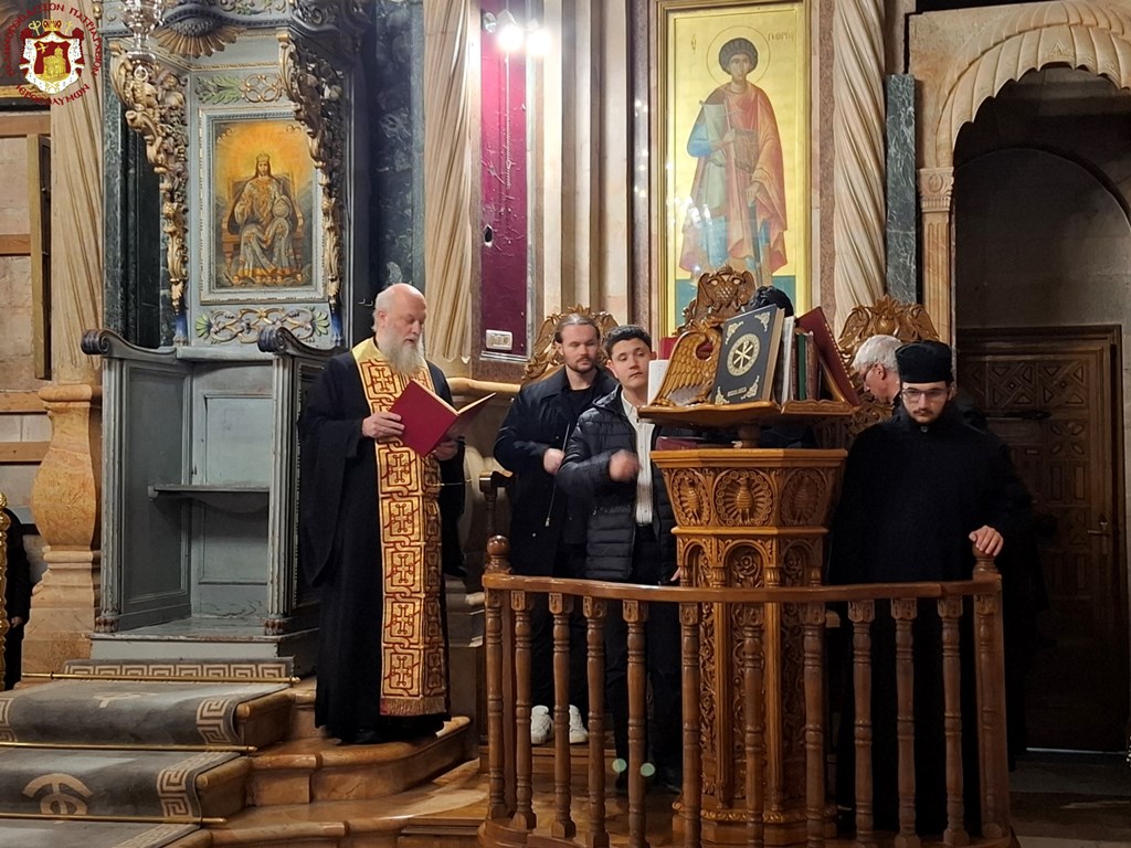 Το εσπέρας της Παρασκευής, 27 Φεβρουαρίου 2026, στο Καθολικό του Ναού της Αναστάσεως, ανεγνώσθη η Α’ Στάση των Χαιρετισμών του Ακαθίστου Ύμνου στο πλαίσιο της Ακολουθίας του Μικρού Αποδείπνου και του Κανόνα «Ανοίξω το Στόμα μου», προεξάρχοντος του Πατριάρχη Ιεροσολύμων κ.κ. Θεοφίλου.