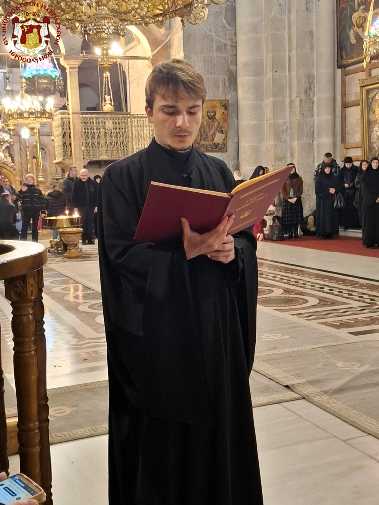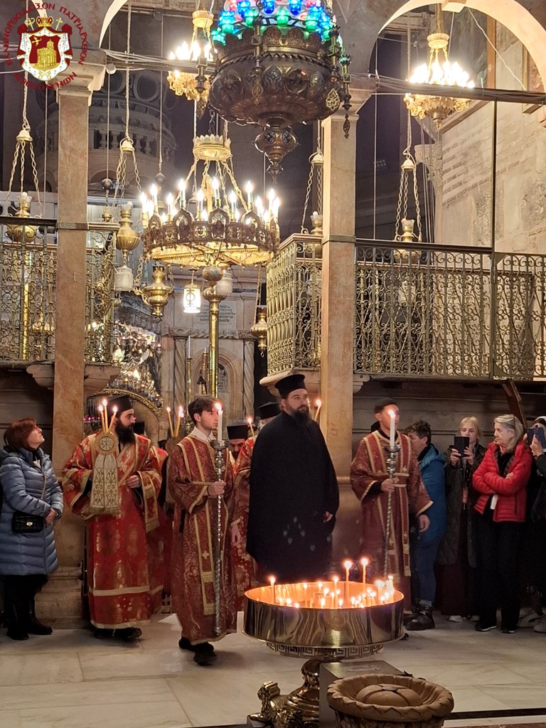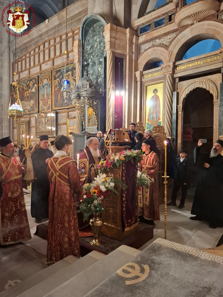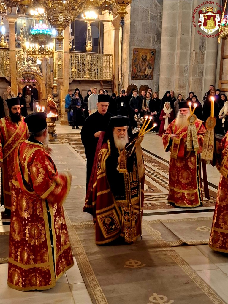 Με τον Μακαριώτατο συμπροσευχήθηκαν Αγιοταφίτες Πατέρες, ο Γέροντας Καμαράσης Αρχιμανδρίτης π. Νεκτάριος, ο Αρχιδιάκονος π. Μάρκος και οι Ιεροδιάκονοι π. Ευλόγιος, π. Γεράσιμος και π. Πρόδρομος, ενώ έψαλαν ο Πρωτοψάλτης του Πανιέρου Ναού της Αναστάσεως διάκονος π. Ευστάθιος και των μαθητές της Πατριαρχικής Σχολής Σιών.