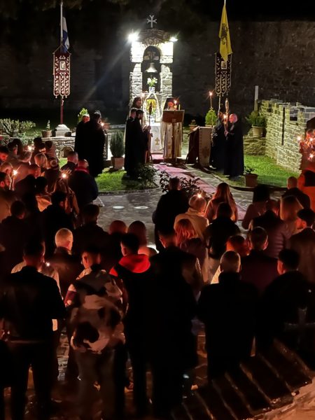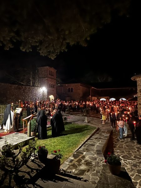 Η λαμπροφόρος νύχτα εφώτισε το Παναγιοσκέπαστο Μολυβδοσκέπαστο, καθώς οι πιστοί, κρατούντες λαμπάδες, έψαλαν με καρδιά το «Πάσχα ιερόν ημίν σήμερον αναδέδεικται», μεταλαμβάνοντας το ανέσπερο φως της Αναστάσεως. Ο Καθηγούμενος της Μονής, Γέρων Αρσένιος, απευθυνόμενος προς τους παρισταμένους προσκυνητές, εκήρυξε το χαρμόσυνο μήνυμα της νίκης της ζωής επί του θανάτου, ανταλλάσσοντας με όλους τον Αναστάσιμο χαιρετισμό· «Χριστός Ανέστη».