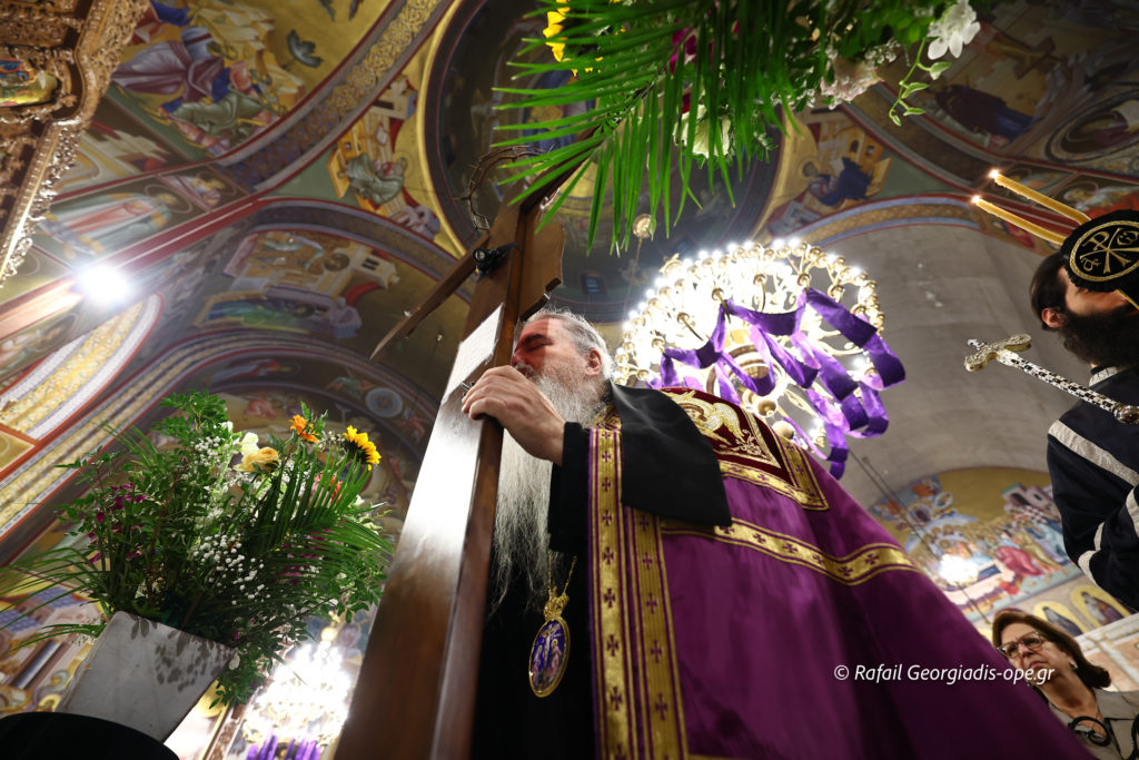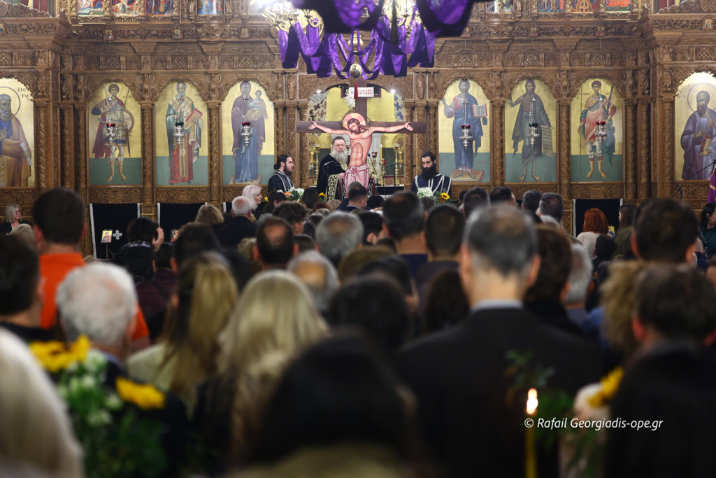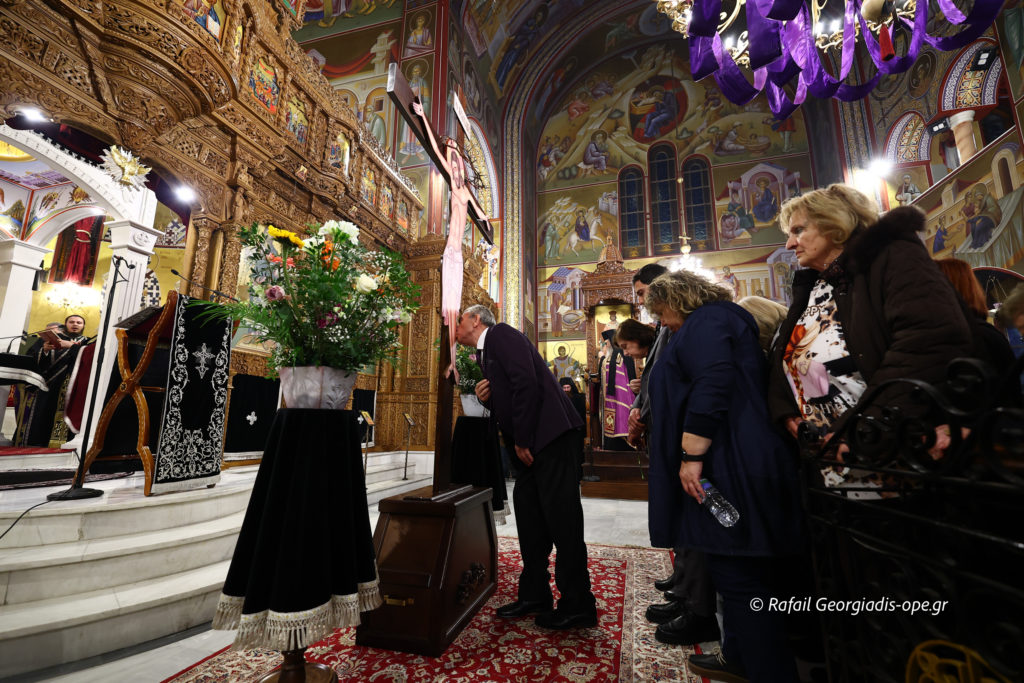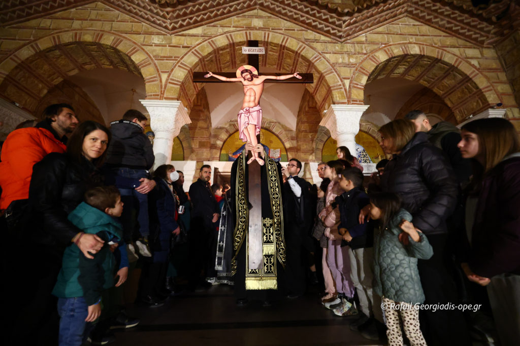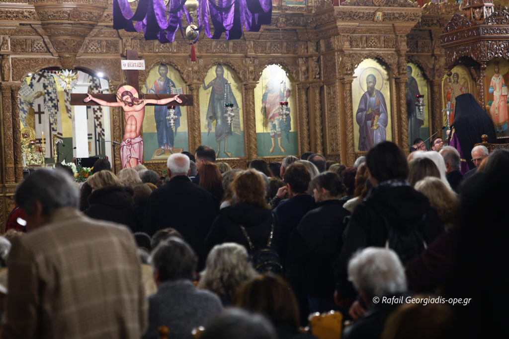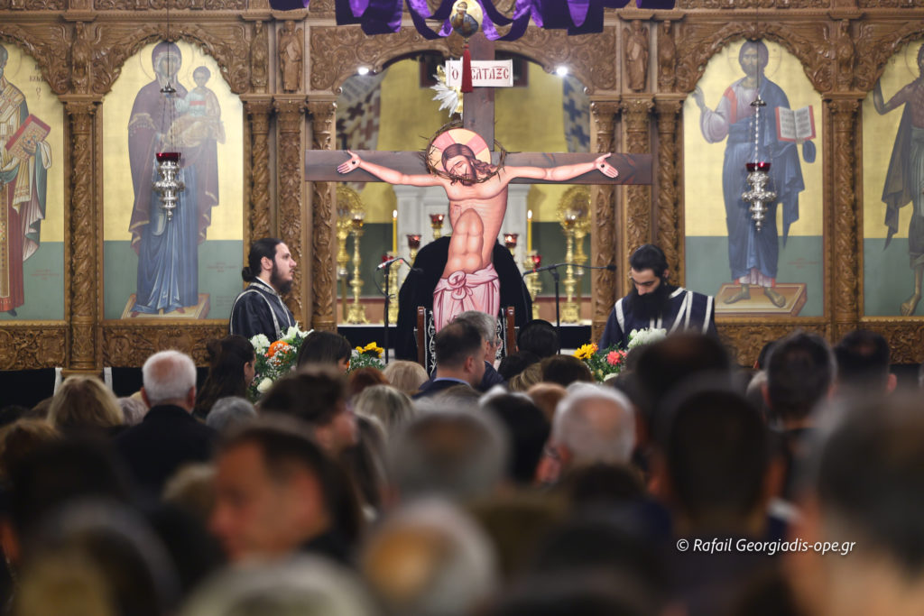 Πιστοί κάθε ηλικίας, κρατώντας λουλούδια και αναμμένα κεριά, προσήλθαν με ευλάβεια για να προσκυνήσουν τον Εσταυρωμένο Κύριο, ο οποίος οδηγήθηκε εκουσίως στο Πάθος για τη σωτηρία του κόσμου. Προσευχήθηκαν σιωπηλά, εναποθέτοντας στον Σταυρό τις σκέψεις, τους πόνους και τους λογισμούς τους, σε μια βαθιά προσωπική στιγμή συνάντησης με τον Θεό της Αγάπης.
