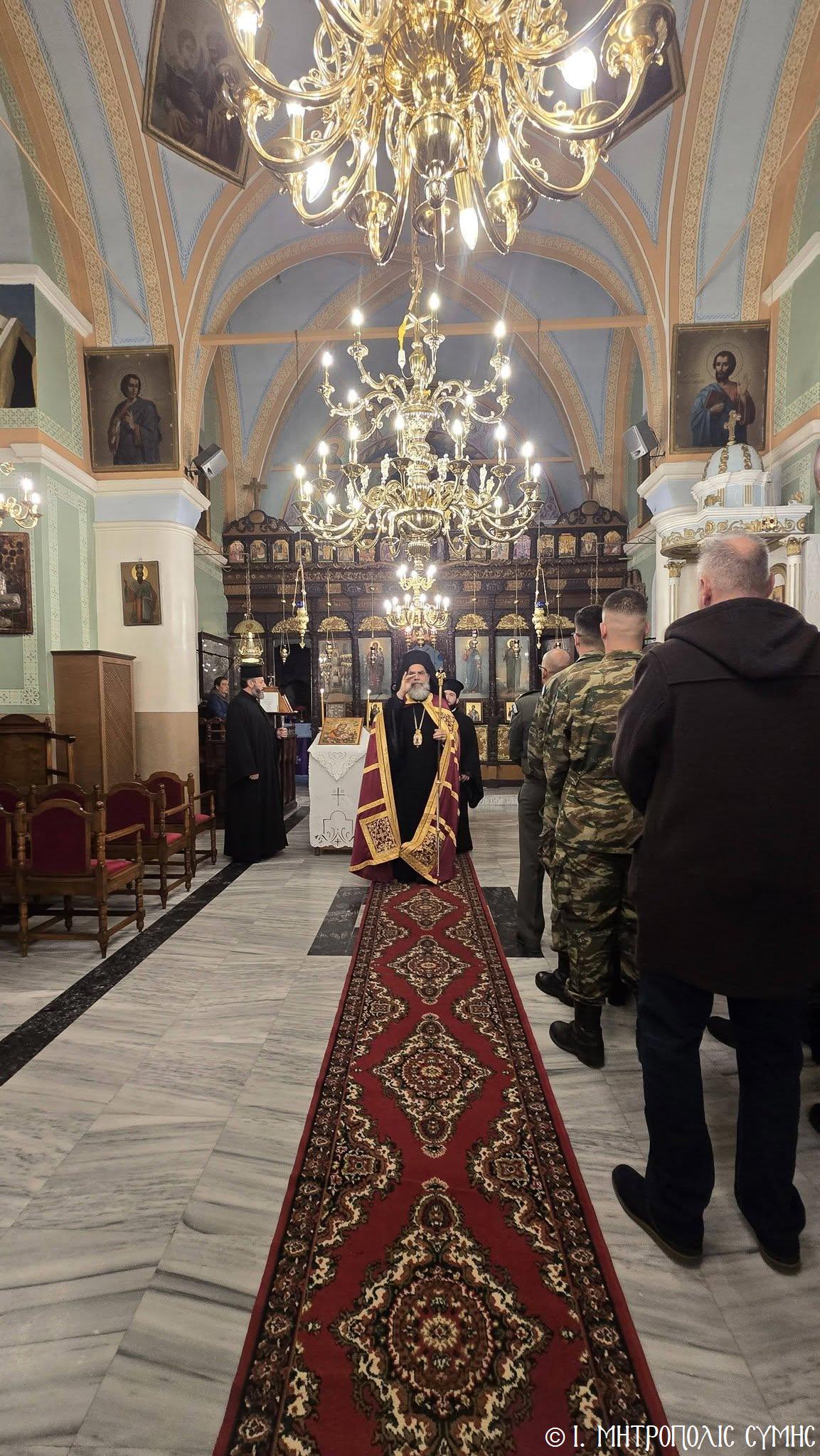 Τα ιερά αναλόγια διακόνησαν σεμνοπρεπώς οι Ιεροψάλτες κ. Αγαπητός Μιχελλής, κ. Ελευθέριος Ξηράκης και κ. Ιωάννης Τσίγκος, ενώ μεταξύ των πολυπληθών Χριστιανών, εκκλησιάσθη ο Διοικητής Δ.Α.Ν. Σύμης, Συνταγματάρχης κ. Νικόλαος Βλαστουδάκης, μετά του Υποδιοικητού Αντισυνταγματάρχου κ. Ευαγγέλου Χατζημιχάλη, ως και στρατιωτικής αντιπροσωπείας.