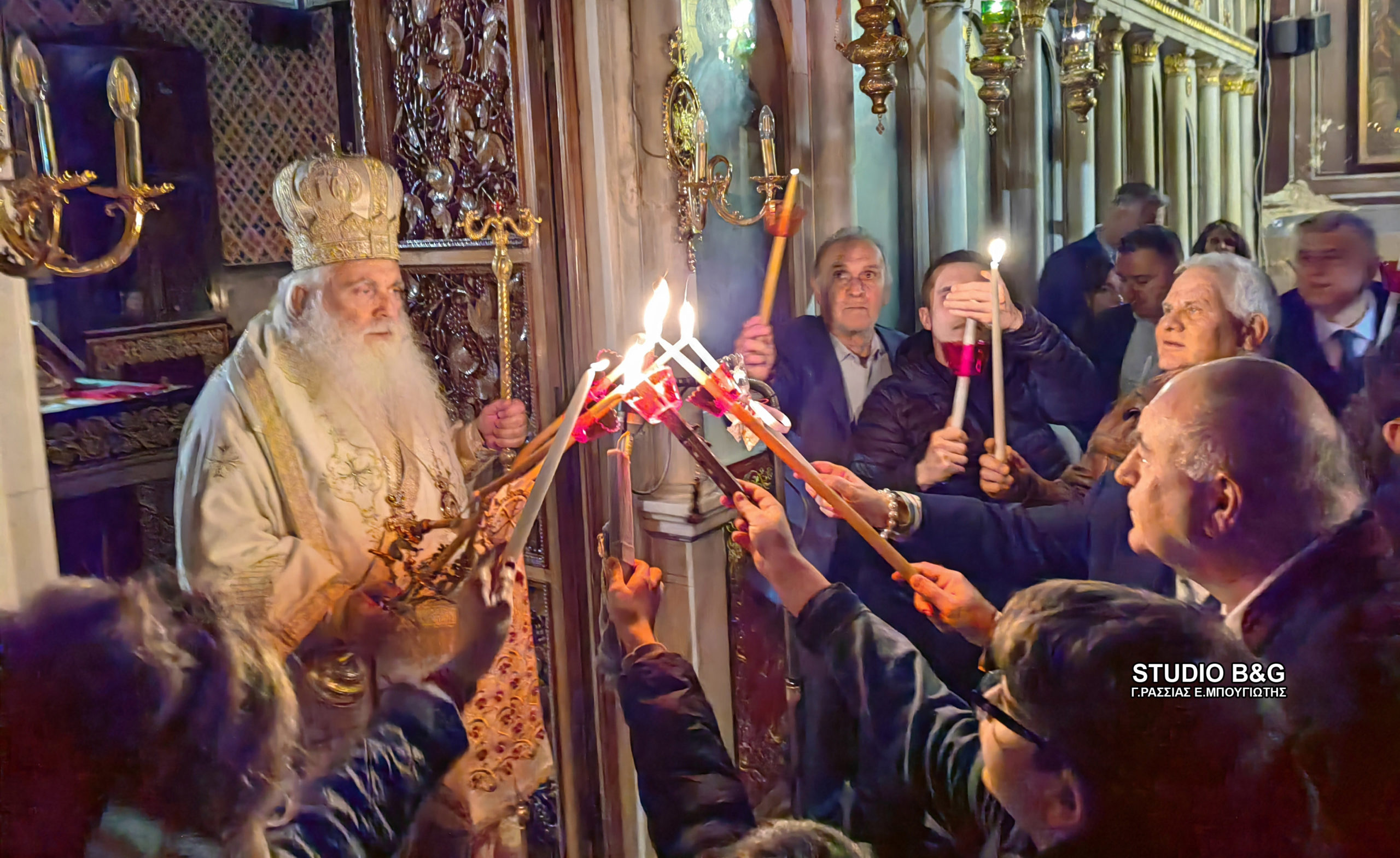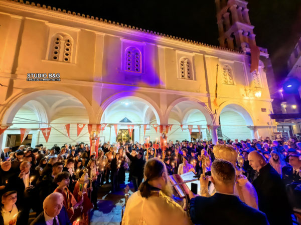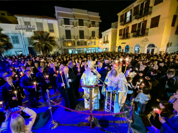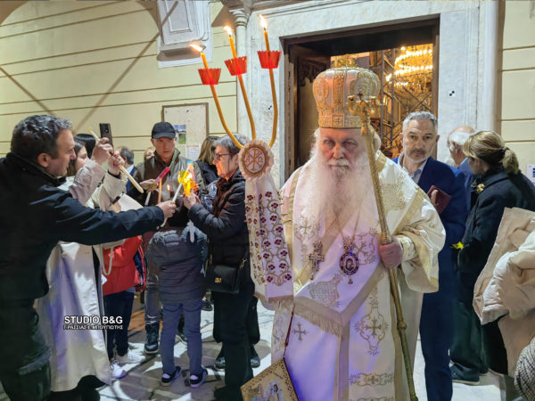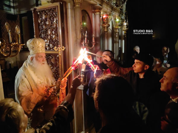 Τα μεσάνυχτα του Μεγάλου Σαββάτου προς Κυριακή του Πάσχα στον Μητροπολιτικό Ναό του Αγίου Γεωργίου, όπως και σε όλες τις εκκλησίες έσβησαν τα φώτα και ο Μητροπολίτης Αργολίδας πρόβαλε στην Ωραία Πύλη, κρατώντας σε κάθε χέρι από μία δεσμίδα τριάντα τριών κεριών με το Άγιο Φως, και ψάλλοντας το «Δεύτε λάβετε Φως…». Στην συνέχεια ιερείς, ψάλτες και πιστοί βγήκαν στο περίβολο της εκκλησίας όπου έγινε η ανάγνωση του Ευαγγελίου της Αναστάσεως.