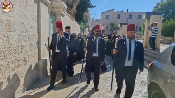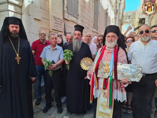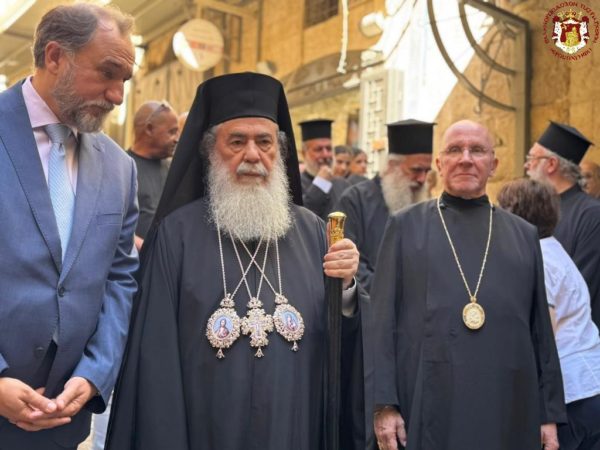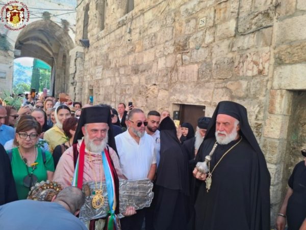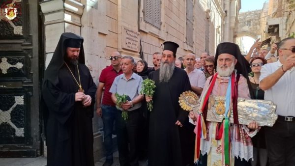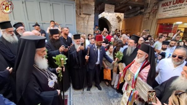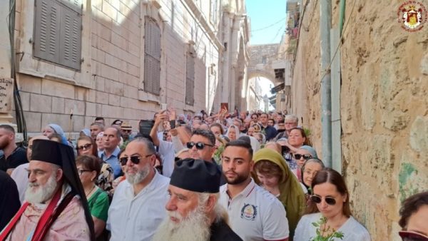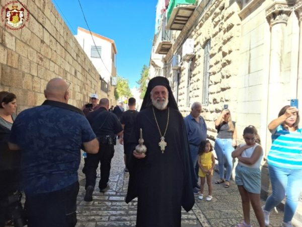 Ακολούθως έφτασε στη διασταύρωση της Οδού του Πατριαρχείου με την Χριστιανική Οδό, όπου την ανέμενε ο Πατριάρχης Ιεροσολύμων κ.κ. Θεόφιλος μαζί με Πατέρες Αγιοταφίτες.