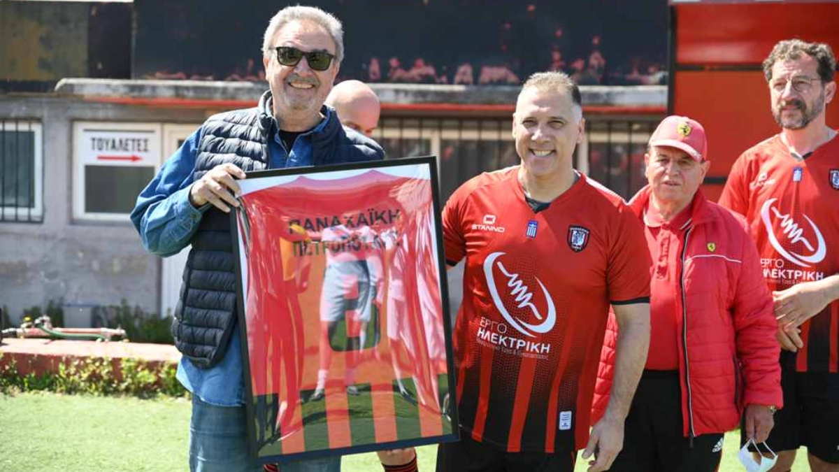Ο Τάκης Πετρόπουλος στη συνέχεια παραβρέθηκε στον Αγώνα Παλαιμάχων Παναχαϊκής – Βετεράνων Πάτρας που έγινε στο Γήπεδο της Αγυιάς, όπου οι Παλαίμαχοι ποδοσφαιριστές του επιφύλαξαν μία ευχάριστη έκπληξη, τη φανέλα με το Νο 8 που φορούσε με την ομάδα μπάσκετ της Παναχαϊκής.