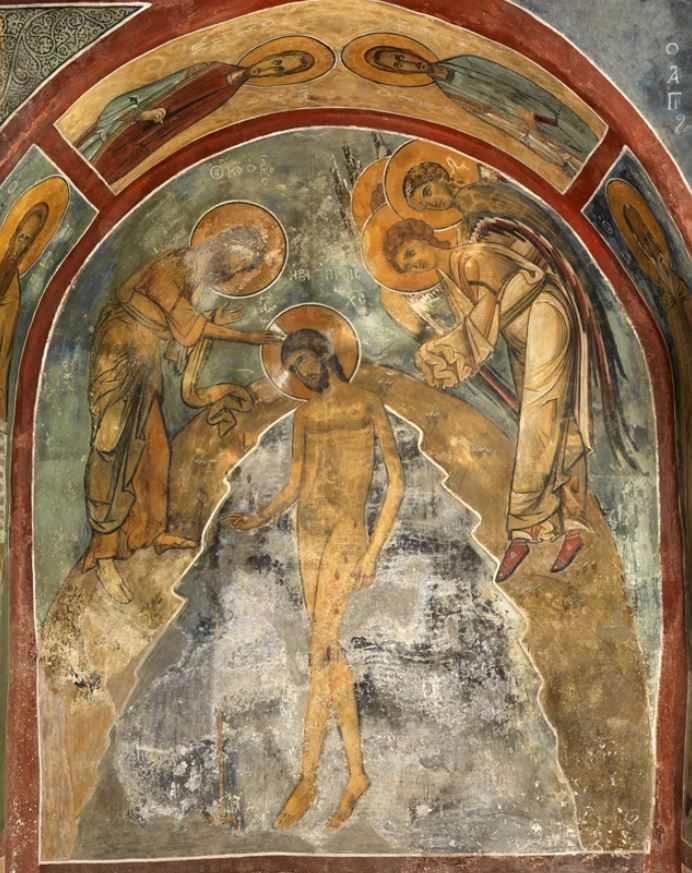 Στην εικόνα ο Χριστός με το δεξί χέρι ευλογεί τα νερά και τα ετοιμάζει να γίνουν τα νερά της βαπτίσεως που αγιάζει με την ίδια του κατάδυση. «Κοιτάζει μπροστά με πρόσωπο σοβαρό για το μέγα μυστήριο που γίνεται. Το σώμα Του είναι ωσάν σκαλισμένον εις ξύλον με διάφορα σχήματα γραμμένα ζωηρά εις το στήθος, εις τους ώμους, εις την κοιλίαν και ουχί σαρκώδες». Τα πόδια Του παριστάνονται σαν να βηματίζουν γιατί όπως παρατηρεί ο Ουσπένσκη η πρωτοβουλία να βαπτισθεί ανήκε σ’ Αυτόν. Με τη θέλησή Του ήλθε ο Κύριος στον Ιορδάνη και ζήτησε να βαπτισθεί από τον Ιωάννη.