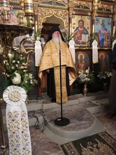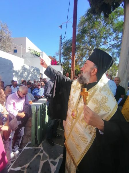 Στον πανηγυρικό Εσπερινό χοροστάτησε ο Σεβασμιώτατος Μητροπολίτης Θήρας, Αμοργού και Νήσων κ. Αμφιλόχιος, ο οποίος στο κήρυγμά του ανέδειξε το βαθύτερο νόημα του Σταυρού, τονίζοντας ότι το πολίτευμα του Σταυρού είναι η αγάπη, η υπακοή στο θέλημα του Θεού, η θυσία και η προσφορά. Οι αρετές αυτές, όπως υπογράμμισε, δεν αποτελούν αφηρημένες έννοιες, αλλά τον ίδιο τον τρόπο ζωής των Αγίων, που έγιναν «μιμηταί Χριστού» μέσα από τον σταυρικό τους αγώνα. Ο Σεβασμιώτατος κάλεσε τους πιστούς να ακολουθήσουν κι εκείνοι τον δρόμο της αυταπάρνησης και της έμπρακτης αγάπης, ώστε να καταστούν αληθινοί μάρτυρες της πίστεως στη σύγχρονη κοινωνία.