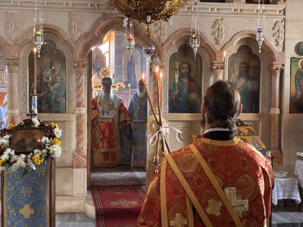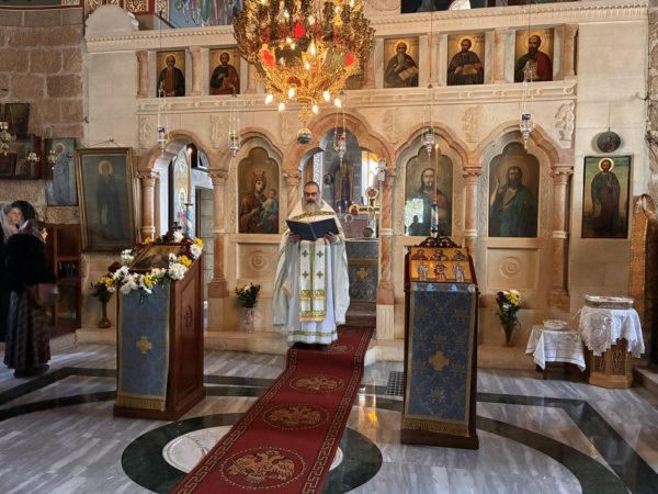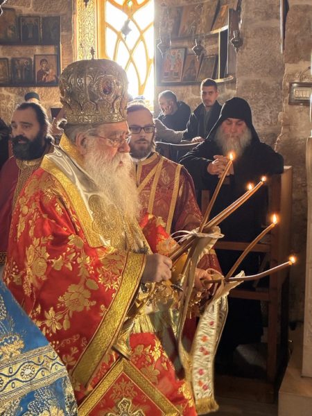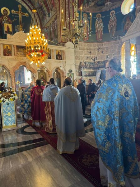 Τῆς πανηγυρικῆς θείας Λειτουργίας προεξῆρξεν ὁ Πατριαρχικός Ἐπίτροπος Βηθλεέμ Σεβασμιώτατος Μητροπολίτης Διοκαισαρείας κ. Βενέδικτος, συλλειτουργούτων αὐτῷ τοῦ Ἡγουμένου τοῦ Χωρίου τῶν Ποιμένων καί τῆς Μπετζάλλας Ἀρχιμανδρίτου π. Ἰγνατίου, τοῦ βοηθοῦ Πατριαρχικοῦ Ἐπιτρόπου Ἀρχιμανδρίτου π. Πολυκάρπου, τοῦ παρεπιδημοῦντος Ἀρχιμανδρίτου π. Χρυσοστόμου τῆς Ἐκκλησίας τῆς Ἑλλάδος, τῶν Ἱερέων τῶν ὁμόρων περιοχῶν π.Ἠλία καί π. Γιοῦσεφ, ψάλλοντος τοῦ Πρωτοψάλτου τοῦ Πανιέρου Ναοῦ τῆς Ἀναστάσεως διακόνου π. Εὐσταθίου καί τῶν Σαββαϊτῶν Πατέρων ἑλληνιστί καί χορῳδίας ἐκ Μπετζάλλας καί Χωρίου τῶν Ποιμένων άραβιστί, ἐν συμμετοχῇ προσκυνητῶν ἐκ διαφόρων χωρῶν καί ἐντοπίων Ὀρθοδόξων ἐκ Βηθλεέμ, Μπετζάλλας καί Χωρίου τῶν Ποιμένων.