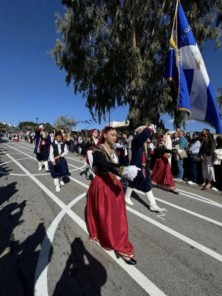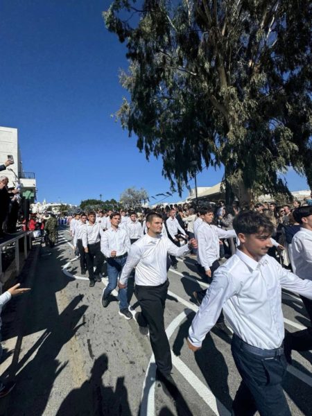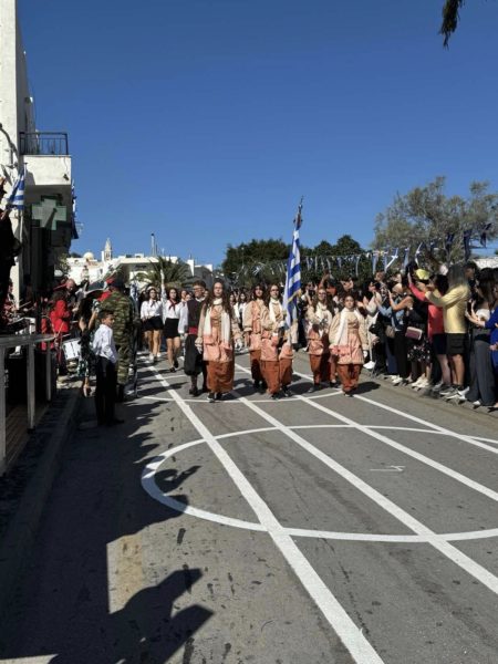 Οι εκδηλώσεις κορυφώθηκαν με την παρέλαση μαθητών όλων των βαθμίδων, πολιτιστικών συλλόγων καθώς και τμήματος της Εθνοφυλακής Θήρας, υπό τους ήχους της Φιλαρμονικής Ορχήστρας του Δήμου Θήρας.