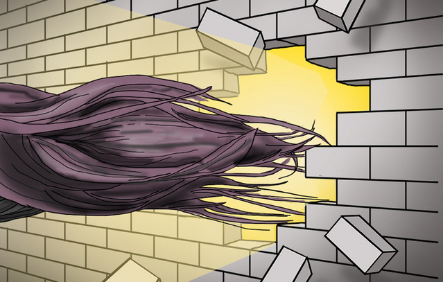 Στο σκίτσο απεικονίζεται ένας σκοτεινός τοίχος φυλακής, ο οποίος έχει ραγίσει και ανοίξει, δημιουργώντας μια τρύπα από την οποία διαχέεται έντονο φως. Από το άνοιγμα διακρίνονται μακριά σκούρα μαλλιά να απομακρύνονται, σαν μια ανθρώπινη φιγούρα να διαφεύγει προς το φως, αφήνοντας πίσω της το σκοτάδι και τον εγκλεισμό.