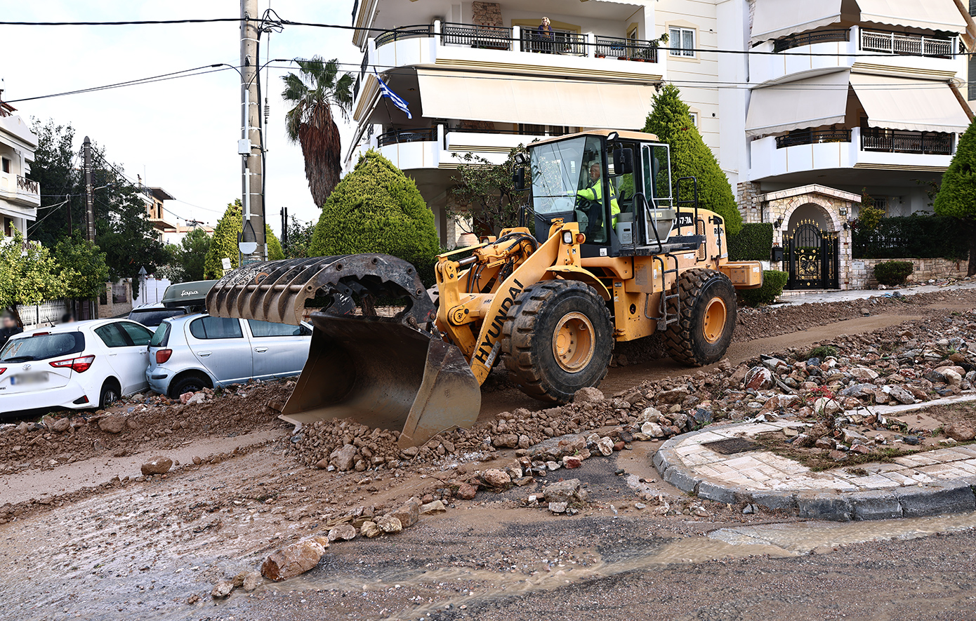 Τα ορμητικά νερά «κατέβασαν» δεκάδες αυτοκίνητα, κάδους, πέτρες και άλλα αντικείμενα, σχηματίζοντας «βουνά» από φερτά υλικά, προκαλώντας εκτεταμένες φθορές και δημιουργώντας πρωτοφανείς εικόνες. «Βομβαρδισμένο» τοπίο θυμίζει ειδικότερα η οδός Μετσόβου στην Άνω Γλυφάδα.