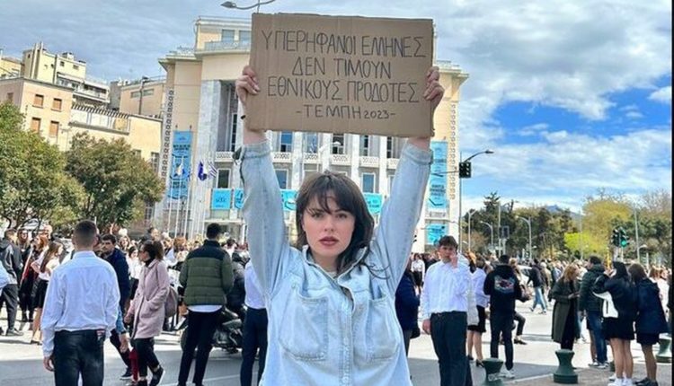 Η Ευδοκία Τσαγκλή βρέθηκε στη μαθητική παρέλαση στη Θεσσαλονίκης, κρατώντας ένα χαρτόνι που έγραφε: «Υπερήφανοι Έλληνες δεν τιμούν εθνικούς προδότες – Τέμπη 2023».
