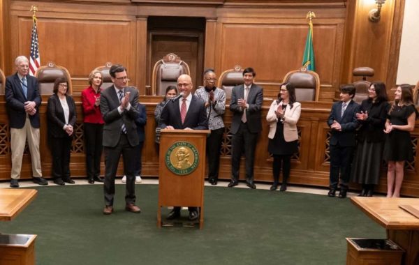 Ο Theo Angelis απευθύνει σύντομο χαιρετισμό προς τον Κυβερνήτη, τα μέλη του δικαστηρίου, την οικογένεια και τους φίλους του μετά τον διορισμό του. Φωτογραφία: Γραφείο Κυβερνήτη της Πολιτείας Ουάσιγκτον.
