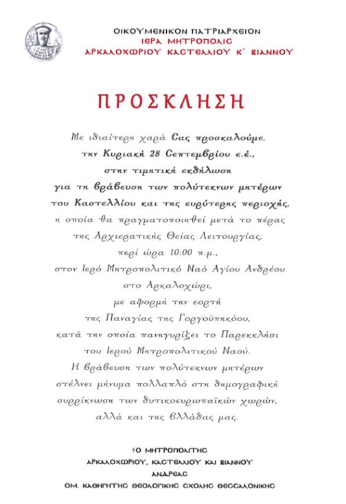 Η Ιερά Μητρόπολη Αρκαλοχωρίου, Καστελλίου και Βιάννου προσκαλεί στην Κυριακή 28 Σεπτεμβρίου στην τιμητική εκδήλωση για τη βράβευση των πολύτεκων μητέρων του Καστελλίου και της ευρύτερης περιοχής.