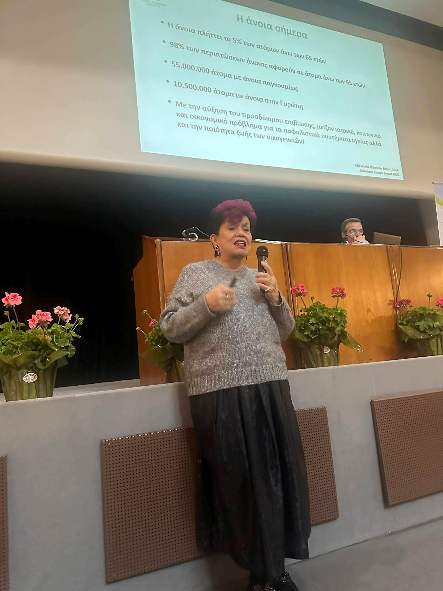 Κεντρική ομιλήτρια ήταν η Δρ Παρασκευή Σακκά, Νευρολόγος – Ψυχίατρος, Πρόεδρος της Εταιρείας Alzheimer Αθηνών και Πρόεδρος του Εθνικού Παρατηρητηρίου για την Άνοια και τη νόσο Alzheimer, η οποία ανέπτυξε το θέμα της πρόληψης της άνοιας, επισημαίνοντας τη σημασία της έγκαιρης ενημέρωσης, της διάγνωσης και της ολιστικής αντιμετώπισης της νόσου.