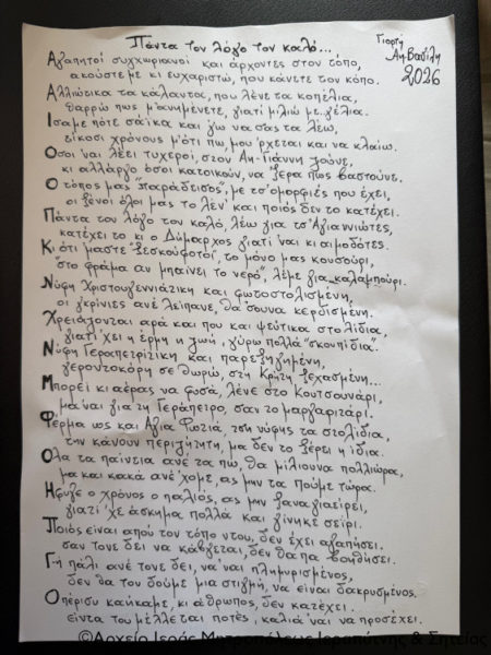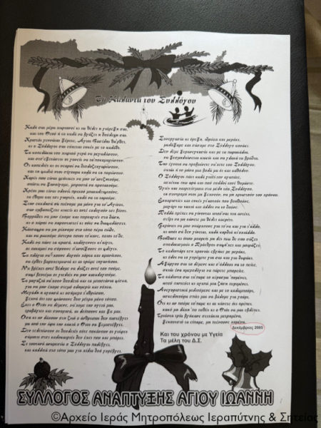 Επίσης επίκαιρα κάλαντα και ευχές, που συνέθεσε ο ίδιος σε στίχο δεκαπεντασύλλαβο, απήγγειλε και φέτος με τον δικό του μοναδικό τρόπο ο γνωστός οδοντίατρος κ. Νίκος Λαμπράκης, ιδρυτικό μέλος και πρώην Πρόεδρος του ιστορικού Συλλόγου του Αγίου Ιωάννου.