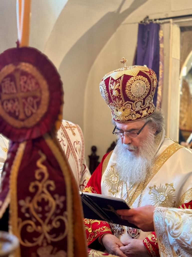 Ἡ προσκύνησις δέ καί ἀναστήλωσις τῶν ἁγίων εἰκόνων δέν ἀποτελεῖ ἁπλῶς ἱστορικόν γεγονός, ἀλλ΄ ἀφορᾷ εἰς τό μέγα μυστήριον τῆς θείας καί σωτηριώδους Οἰκονομίας. Διό καί ἡμεῖς, παρά τήν ἐπισυμβαίνουσαν πολεμικήν κρίσιν (καί τήν συνέπειαν αὐτῆς, μή δυνηθέντες νά κατέλθωμεν εἰς τόν Πανίερον Ναόν τῆς Ἀναστάσεως μετέβημεν εἰς τόν τοῦ κεντρικοῦ ἡμῶν Μοναστηρίου Ναόν τῶν ἁγίων Θεοστέπτων καί Μεγάλων Κωνσταντίνου καί Ἑλένης, ἔνθα ἐτελέσαμεν τήν «Μεγάλην Παρρησίαν» τῆς Α΄ Κυριακῆς τῶν Νηστειῶν, τοὐτέστιν τήν Πατριαρχικήν θείαν Λειτουργίαν , συλλειτουργούντων ἡμῖν τῶν Τιμίων μελῶν τῆς Ἁγιοταφιτικῆς ἡμῶν Ἀδελφότητος Ἀρχιερέων , Ἱερέων, Ἱεροδιακόνων καί συμπροσευχομένων μοναχῶν, μοναζουσῶν καί παρεπιδημούντων εὐλαβῶν προσκυνητῶν.