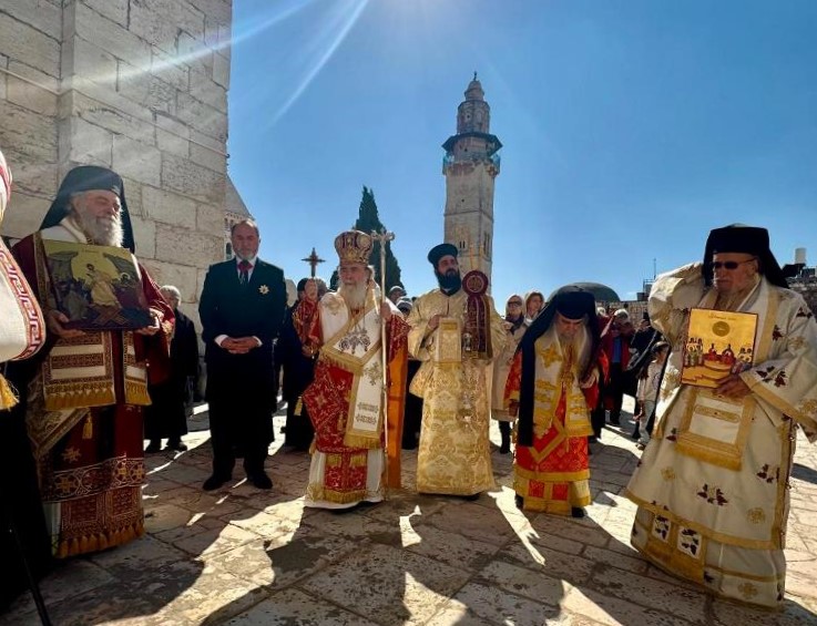 Λόγω του αρξαμένου πολέμου μεταξύ Ηνωμένων Πολιτειών Αμερικής και Ιράν και λόγω των βομβαρδισμών του Ιράν στην ενδοχώρα του Ισραήλ και δη στην Αγία Πόλη Ιερουσαλήμ, ο Εσπερινός της Κυριακής ταύτης της Ορθοδοξίας δεν τελέσθηκε κατά την τάξη στον κλεισμένο Πανίερο Ναό της Αναστάσεως, αλλά στον Πατριαρχικό και μοναστηριακό Ναό των Αγίων Κωνσταντίνου και Ελένης, χοροστατούντος του Μακαριωτάτου Πατριάρχου Ιεροσολύμων κ.κ. Θεοφίλου και συνιερουργούντων των Αγιοταφιτών Πατέρων εφημερίων του Ναού και συμπροσευχομένων των Αγιοταφιτών Αρχιερέων.