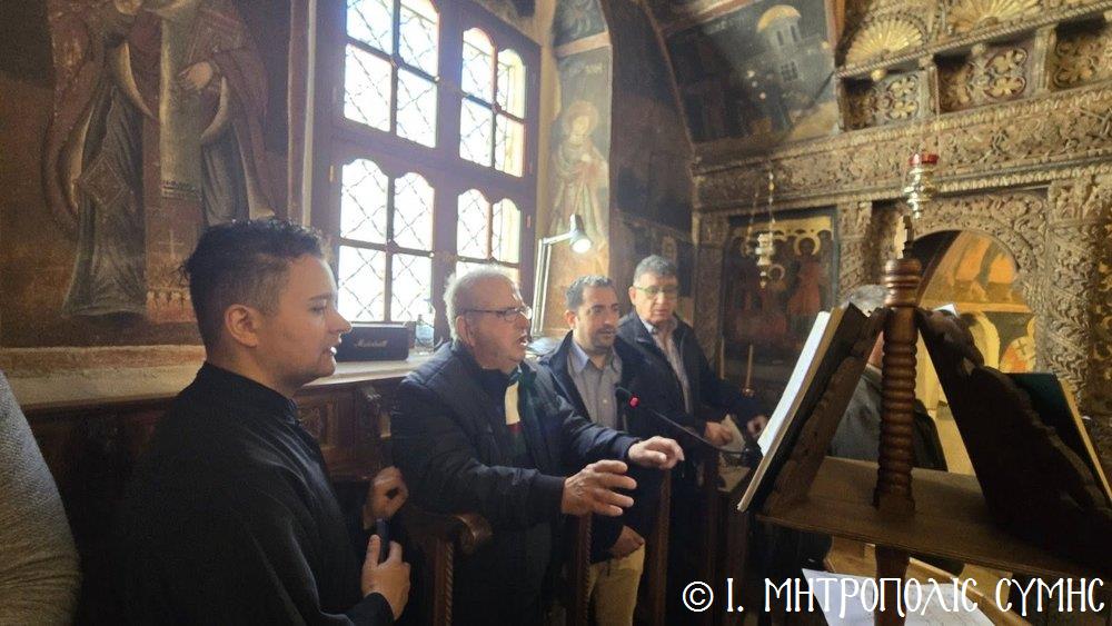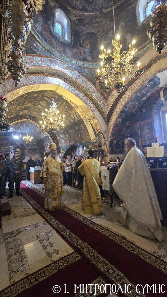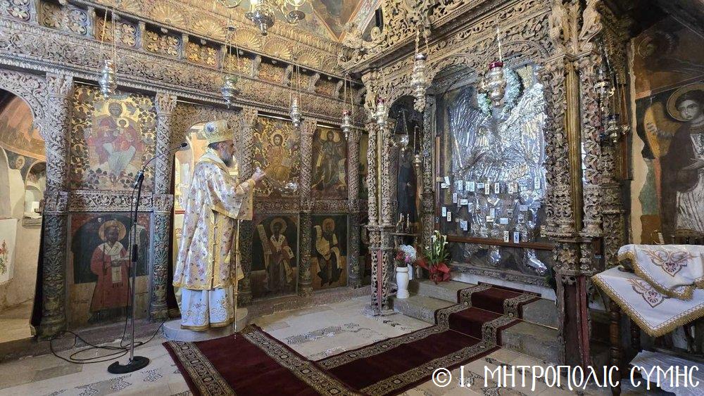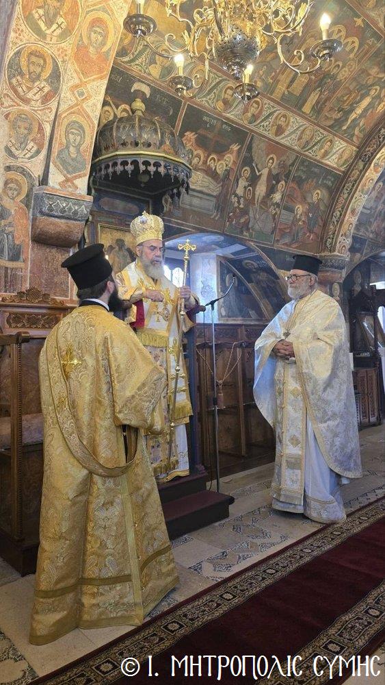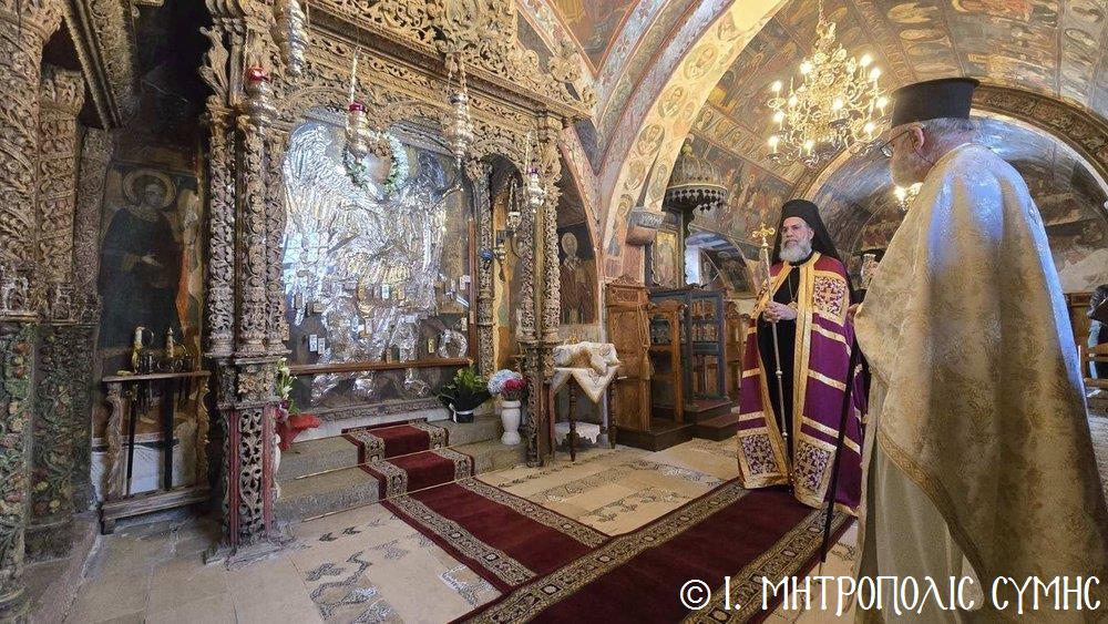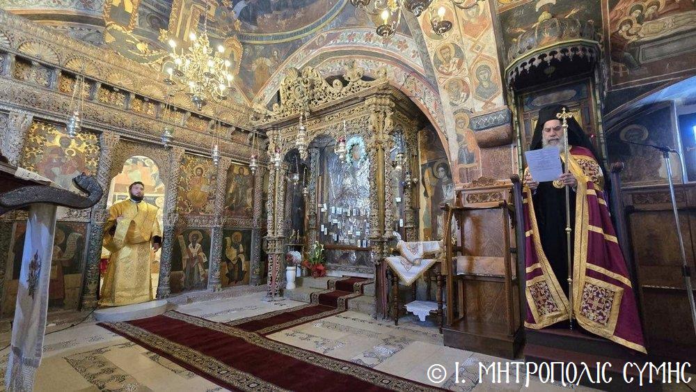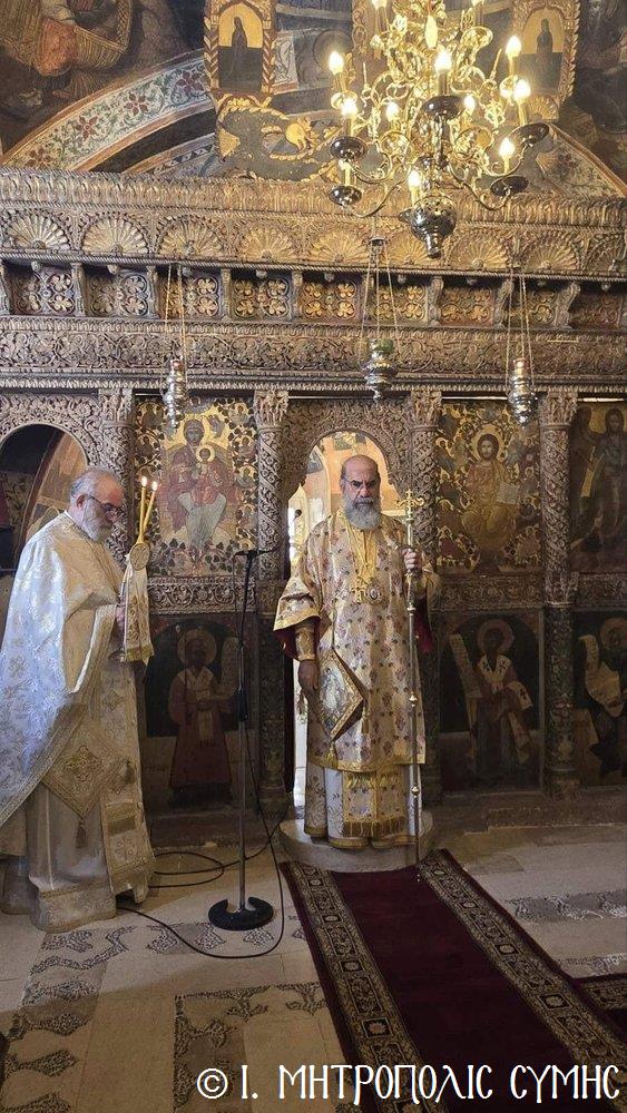 Ο Σεβασμιώτατος ιερούργησε με συλλειτουργούς του τον Ιεροεπιστάτη αυτής Πρωτοπρ. π. Στέφανο Μακρή και τον Ιεροδιάκονο π. Παύλο Τερεζάκη. Το μοναστηριακό αναλόγιο διακόνησαν μελιρρύτως οι καλλικέλαδοι Ιεροψάλτες κ. Δημοσθένης Γιανναράς, μετά του υιού του κ. Μερκουρίου και κ. Ελευθέριος Ξηράκης, ενώ μεταξύ άλλων εκκλησιάστηκαν ο Δήμαρχος Σύμης κ. Ελευθέριος Παπακαλοδούκας και ο Διοικητής Δ.Α.Ν. Σύμης Συνταγματάρχης κ. Νικόλαος Βλαστουδάκης.