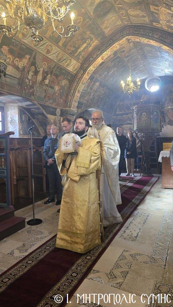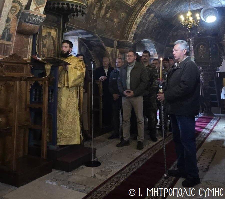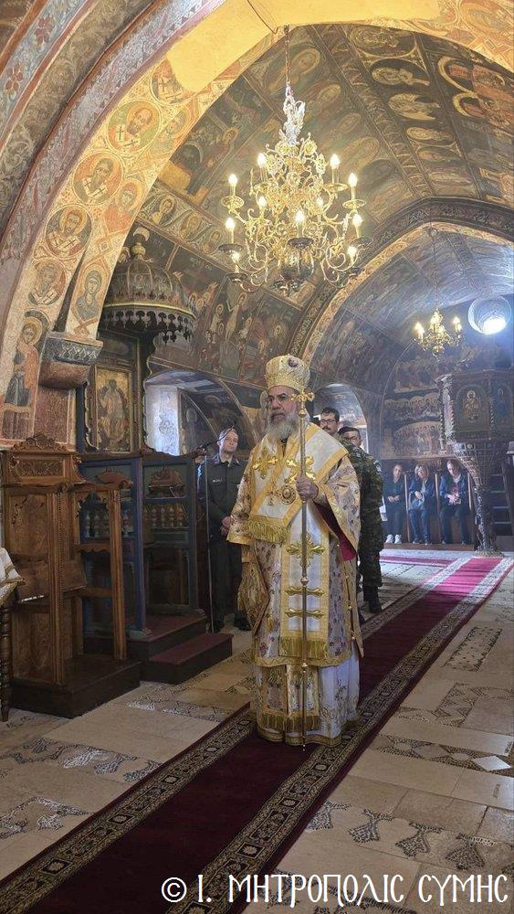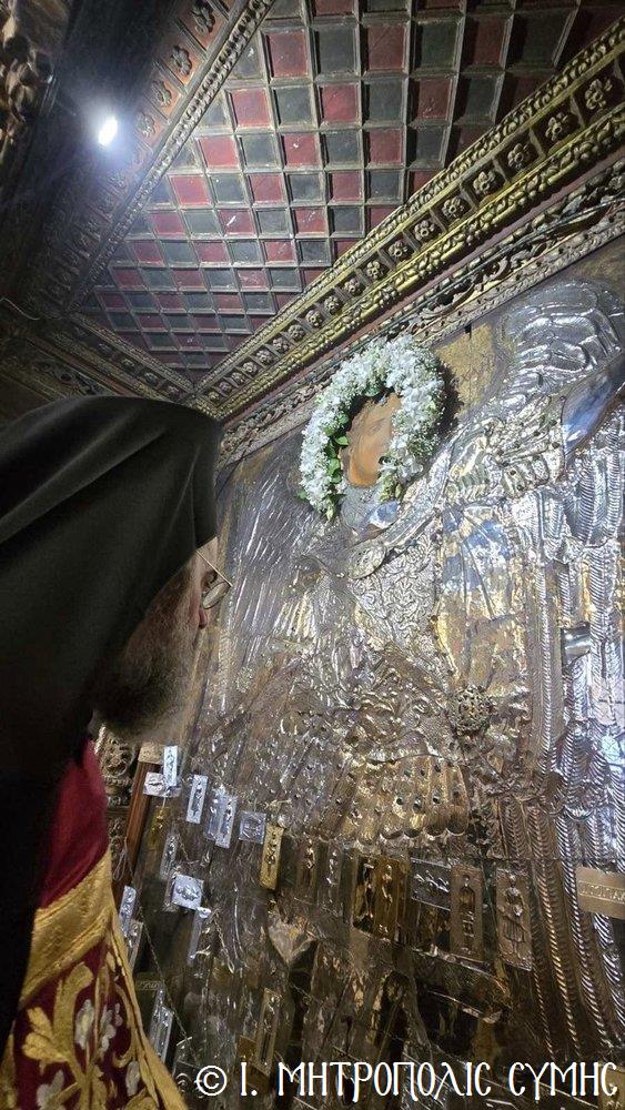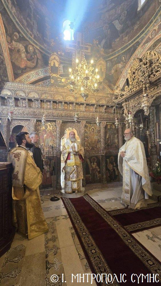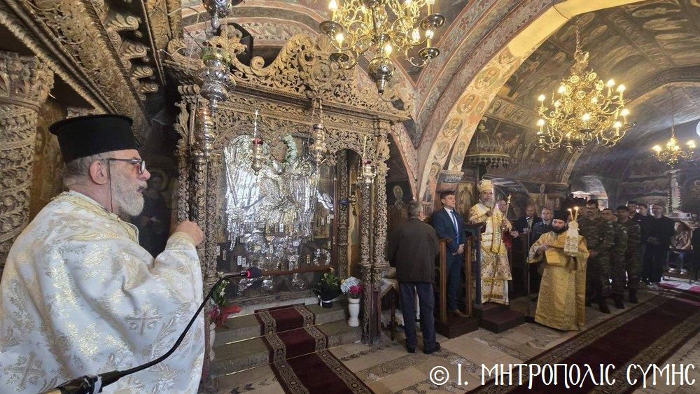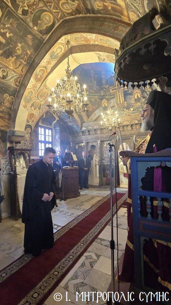 Ο Σεβασμιώτατος ιερούργησε με συλλειτουργούς του τον Ιεροεπιστάτη αυτής Πρωτοπρ. π. Στέφανο Μακρή και τον Ιεροδιάκονο π. Παύλο Τερεζάκη. Το μοναστηριακό αναλόγιο διακόνησαν μελιρρύτως οι καλλικέλαδοι Ιεροψάλτες κ. Δημοσθένης Γιανναράς, μετά του υιού του κ. Μερκουρίου και κ. Ελευθέριος Ξηράκης, ενώ μεταξύ άλλων εκκλησιάστηκαν ο Δήμαρχος Σύμης κ. Ελευθέριος Παπακαλοδούκας και ο Διοικητής Δ.Α.Ν. Σύμης Συνταγματάρχης κ. Νικόλαος Βλαστουδάκης.