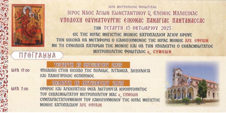 Την Πέμπτη, 16 Οκτωβρίου 2025, στις 07:00 π.μ. θα τελεστεί ο Όρθρος και εν συνεχεία Αρχιερατική Θεία Λειτουργία ιερουργούντος του Σεβ. Μητροπολίτου Φθιώτιδος κ. Συεμών, συμπαραστατουμένου υπό του Καθηγουμένου της Μονής Βατοαπιδίου, Γέροντος Εφραίμ.
