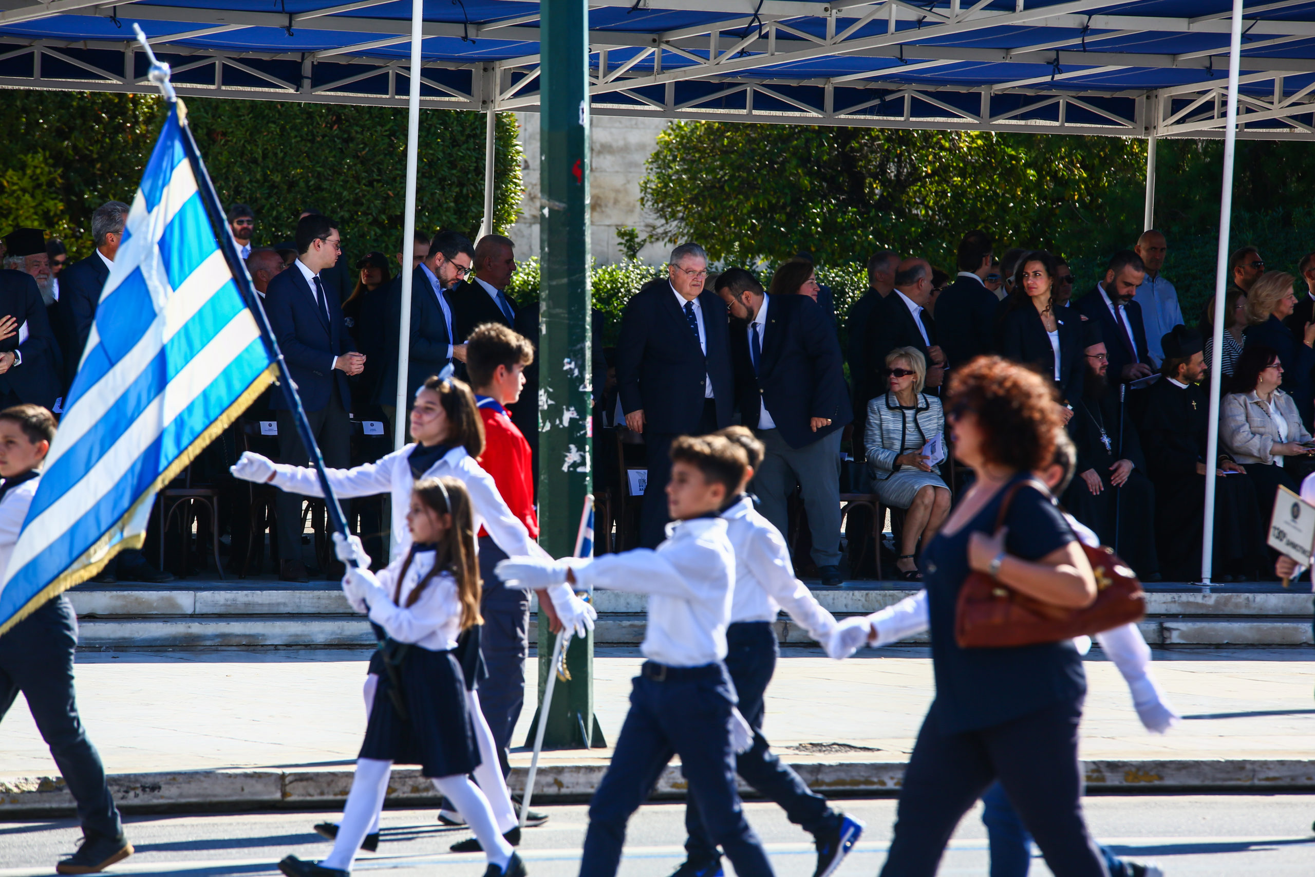 Αντιπροσωπευτικά τμήματα μαθητών και μαθητριών από όλα τα σχολεία του δήμου Αθηναίων παρήλασαν στο κέντρο της πόλης, περνώντας μπροστά από το μνημείο του Άγνωστου Στρατιώτη και το ελληνικό Κοινοβούλιο, συνοδεία της φιλαρμονικής ορχήστρας του Δήμου Αθηναίων.