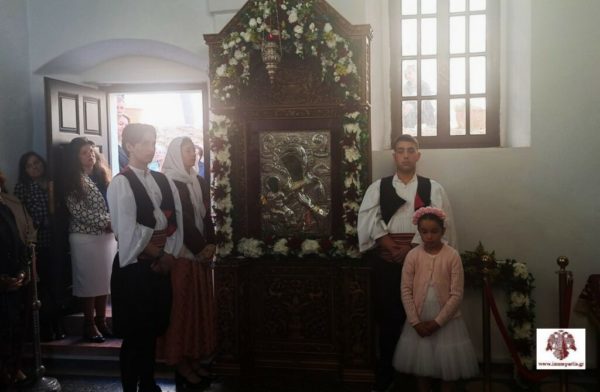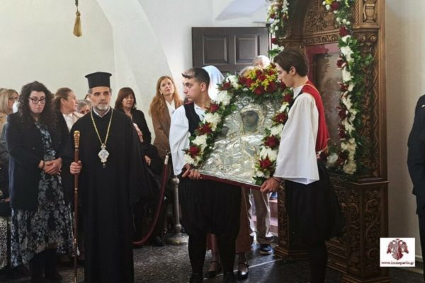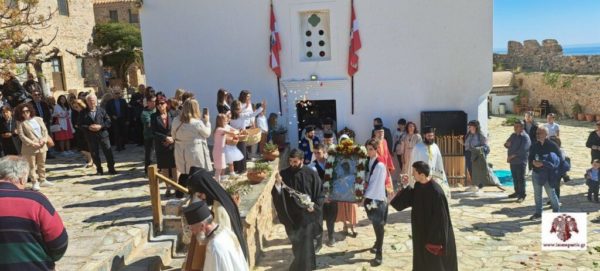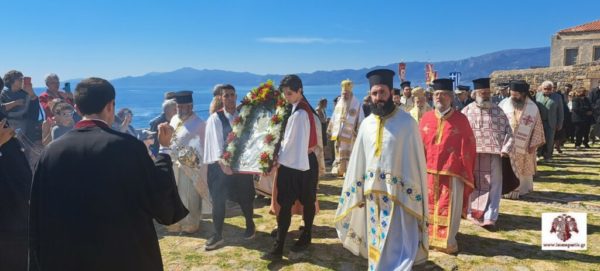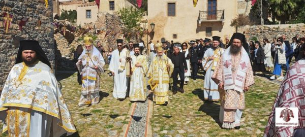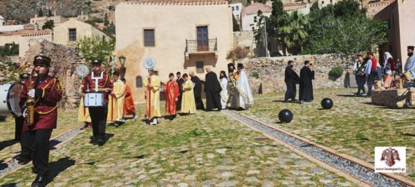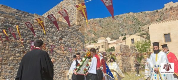 Ακολούθησε, η λιτάνευση της ιερής εικόνας της Παναγίας Χρυσαφίτισσας στην γραφική πλατεία έξωθεν του Ναού και η τέλεση δέησης για την προστασία των χριστιανών της Μονεμβασίας.